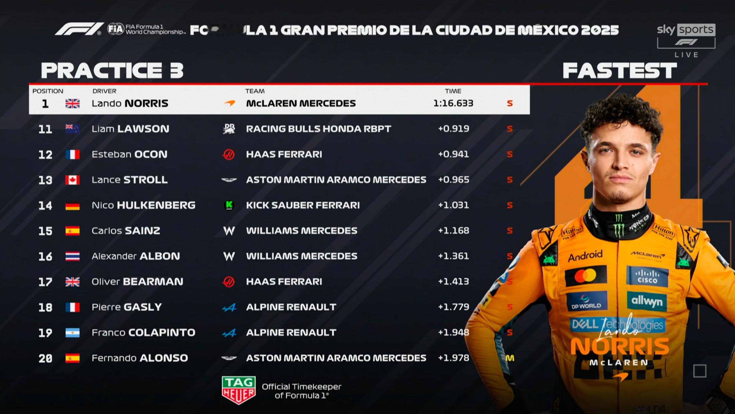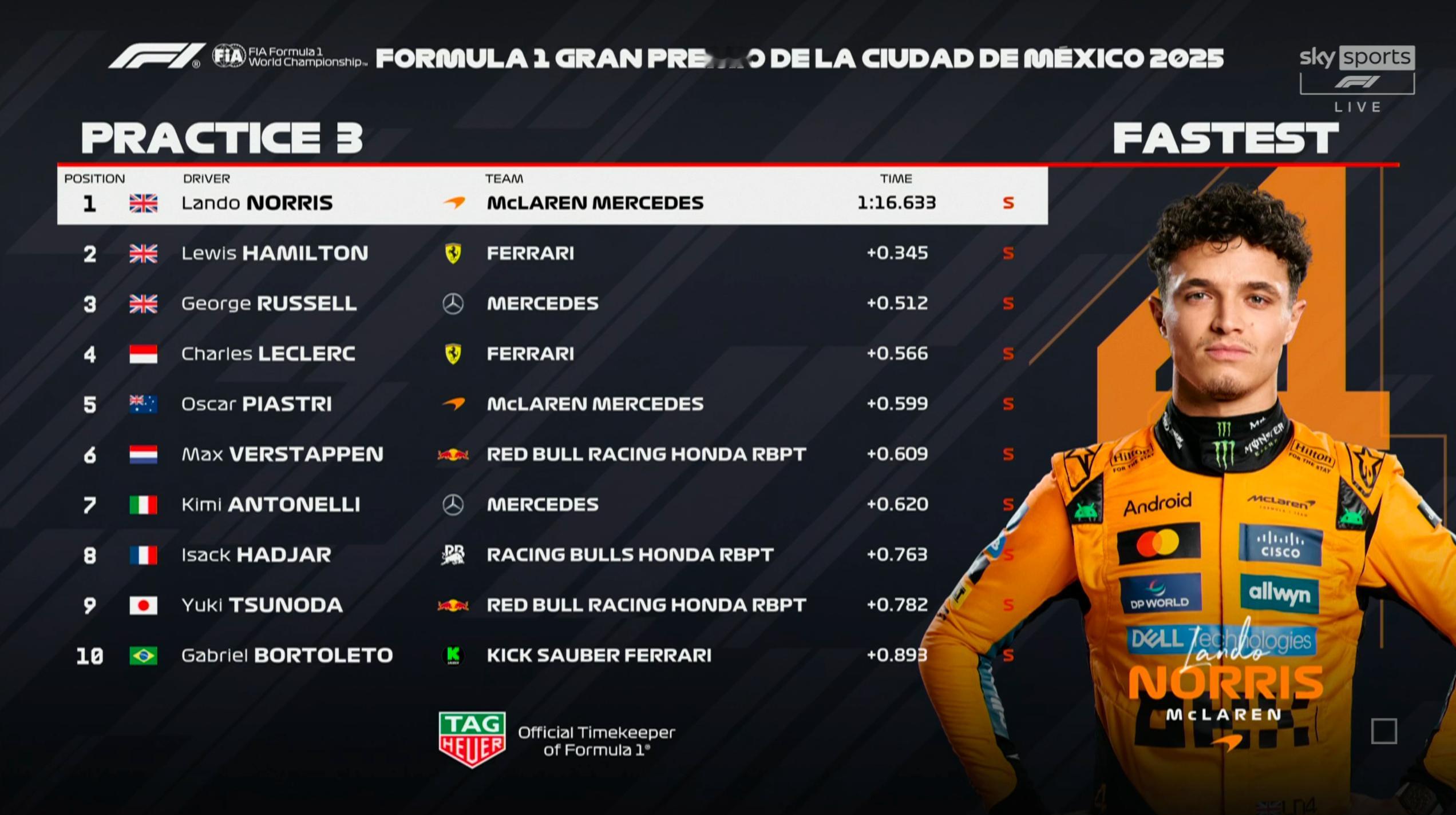 FP3成绩:诺里斯最快,汉密尔顿P2,维斯塔潘P6F12025F1墨西哥城大奖赛