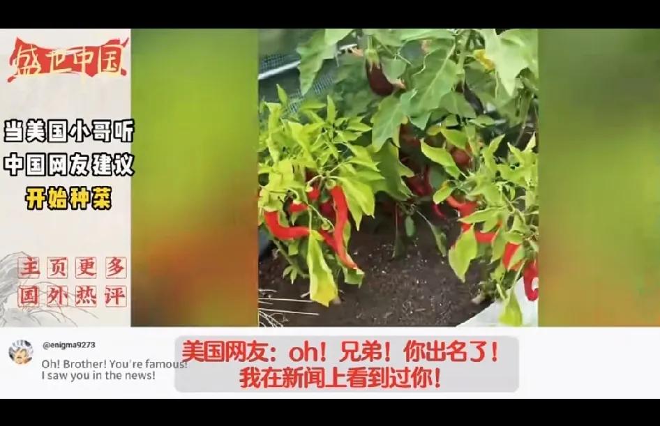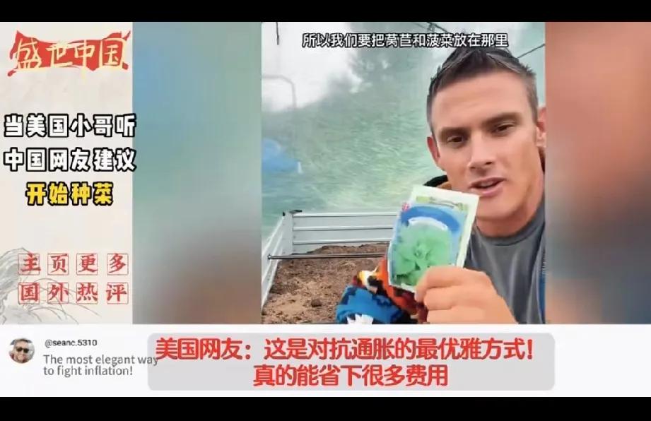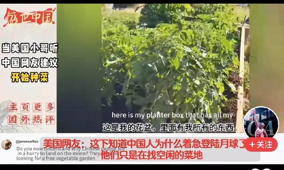 美国小哥听从中国网友的建议在自家后院建了个大棚,并在他们的指导下在大棚里面种上生菜、莴苣、西红柿、辣椒等蔬菜。他把自己种菜的视频发布后,引来众多外国网民的热议。 对普通中国人来说,只要家里有块空地,但凡适宜用来种菜的,都不会让它荒着。没想到这在中国看来平淡无奇的事情,竟会让很多老外感觉不可思议。 对这个美国小哥的操作,外国网民的评论更是让人感觉忍俊不禁。 来看看他们都是如何评论的。 “你找对人了,你找了一个5000岁的师傅。” “我的后院已经闲置了十年,但是我从来没有想到过要在里面种蔬菜。天哪我究竟错过了什么?” “中国人是不是自带种菜的DNA?我的中国邻居一直在做同样的事情。” “种菜只是最基本的操作,接下来中国网友还会教你如何养鸡。” “中国人的24节气就是种菜说明书。” 中国网友也没有闲着,不过他们的评论是另外一种风格。 “当大多数美国人通过种菜实现了自给自足,接着美国就会立法禁止种菜。” “在美国自己种菜有可能是违法的,资本家不允许这么做,否则他们生产的那些保质期10年的罐头卖给谁?”