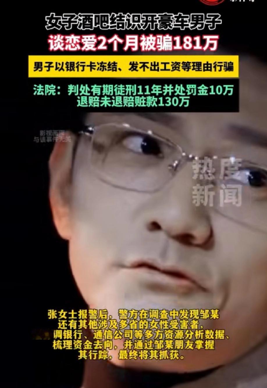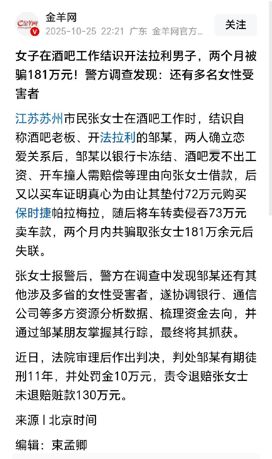 江苏苏州,女子在酒吧结识了开法拉利的男子,以为找到了“高富帅”,很快就确认恋爱关系。不料,恋爱两个月,男子以银行卡冻结、处理肇事等理由向女子借钱,还以给女子买车为由让她垫付72万,陆陆续续被骗181万元,男子突然消失。女子这才反应过来报警,事情的真相让她不寒而栗! 张女士在一家酒吧上班,每天见惯了形形色色的人,心里也悄悄盼着能遇到个靠谱的伴侣。 念念不忘,必有回响。有一天,一个开着法拉利的男人邹某闯进了她的生活,直接让她心里的期待落了地。 邹某自称是这家酒吧的老板,说话做事大方又体面,加上那辆晃眼的法拉利,任谁看都是标准的高富帅。 他对张女士格外上心,嘘寒问暖从不间断,还经常带她去高档餐厅吃饭、送些小礼物。 张女士本来就对他有好感,架不住这般猛烈的追求,没几天就彻底沦陷,爽快地和邹某确认了恋爱关系。 刚恋爱那会儿,邹某对张女士那叫一个体贴,让张女士觉得自己真是撞上了好运,满心欢喜地规划着两人的未来。 可这份甜蜜没持续多久,邹某就开始找各种理由向她借钱。 第一次借钱时,邹某说得情真意切,他的银行卡临时冻结了,酒吧员工工资发不出去,让张女士帮忙垫付一下,还承诺给她利息。 张女士想着两人都要共度一生了,他的事就是自己的事,没多想就转了钱。 接下来的日子里,邹某的理由越来越多,一会儿说开车撞了人需要赔偿,一会儿又说酒吧资金周转不开。 每次借钱,他都把话说得特别诚恳,还会拍着胸脯保证很快就能还上。 张女士被爱情冲昏了头脑,加上对邹某老板身份的信任,每次都有求必应,前前后后借出去了不少钱。 就在张女士心里隐约有些不安时,邹某又抛出了一个定心丸,他要给张女士买辆保时捷帕拉梅拉,以后你出门也有面子。 张女士一听,瞬间被幸福冲晕了头,完全没多想就答应了邹某让她先垫付72万购车款的要求,满心期待着属于自己的新车。 可让她没想到的是,车买完没几天,邹某就以办手续为由把车开走了,之后再也没提过给她车的事。 更让她崩溃的是,没过多久,邹某竟然直接失联了,电话打不通、微信也被拉黑,就像人间蒸发了一样。 直到这时,张女士才如梦初醒,意识到自己可能被骗了。 她赶紧查了一下自己的账户,这两个月里陆陆续续给邹某转了181万余元,其中光是购车款就有72万。 她越想越害怕,赶紧报了警。 警方调查后发现,张女士根本不是唯一的受害者,邹某在多个省份还骗了其他女性。 他开的法拉利是租来的,所谓的酒吧老板身份也是伪造的,骗来的钱大多被他挥霍一空,就连那辆保时捷也被他以73万元转卖,赃款全部据为己有。 通过协调银行、通信公司等多方资源,警方梳理清楚了资金去向,又通过邹某的朋友掌握了他的行踪,最终成功将其抓获。 首先,邹某的行为已经属于诈骗罪。 《刑法》第266条规定,诈骗罪是指以非法占有为目的,用虚构事实或者隐瞒真相的方法,骗取数额较大的公私财物的行为。 邹某自始至终具有非法占有目的,其无真实还款能力却通过欺骗手段持续敛财,骗得钱款后用于挥霍,还将张女士垫付72万购买的保时捷转卖侵吞赃款,毫无还款意愿。 客观上,他伪造酒吧老板身份,租赁法拉利营造高富帅假象,编造银行卡冻结、肇事赔偿、酒吧资金周转等虚假借款理由,骗取张女士181万元,属于数额特别巨大 最高人民法院《关于审理诈骗案件具体应用法律的若干问题的解释》中明确,认定诈骗罪的核心在于行为人是否具有“非法占有为目的”,可通过经济状况、行为方式、钱款用途、事后态度等客观事实综合推定。 邹某自身无稳定收入来源,法拉利为租赁、老板身份为伪造,根本不具备偿还大额借款的经济能力。 他通过多省流窜作案、同时欺骗多名女性的方式敛财,属于有预谋的诈骗行为。 钱款并未用于所谓的“酒吧经营”“事故赔偿”,而是被其挥霍一空,购车款更是直接通过转卖变现据为己有。 因此,邹某完全符合非法占有为目的的司法认定标准。 综上,法院认定邹某的诈骗行为证据确凿,最终被判处有期徒刑11年,并处罚金10万元,同时责令退赔张女士未归还的赃款130万元。 遇到所谓的高富帅时一定要擦亮眼睛,尤其是涉及大额金钱往来,千万要多留个心眼,别让爱情冲昏了头脑,给骗子可乘之机。