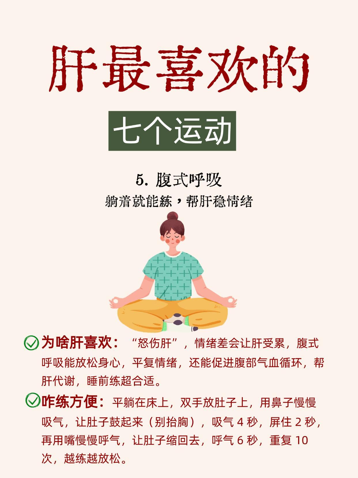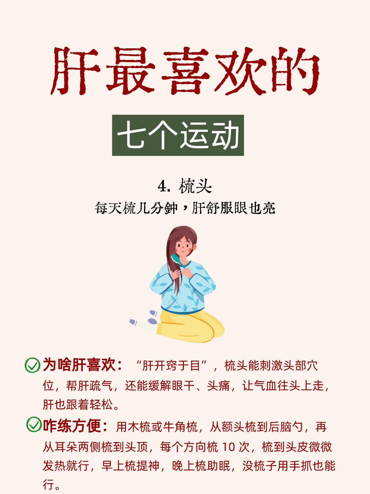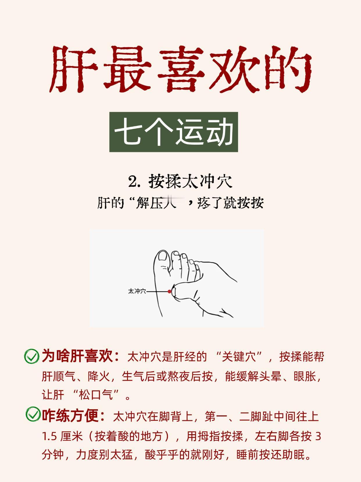 肝最喜欢的7个动作:1、散步2、按揉太冲穴 3、伸懒腰4、梳头5、腹式呼吸6、转