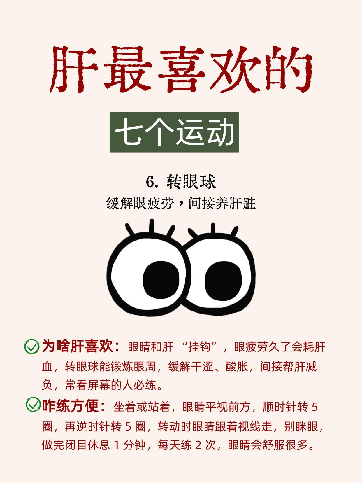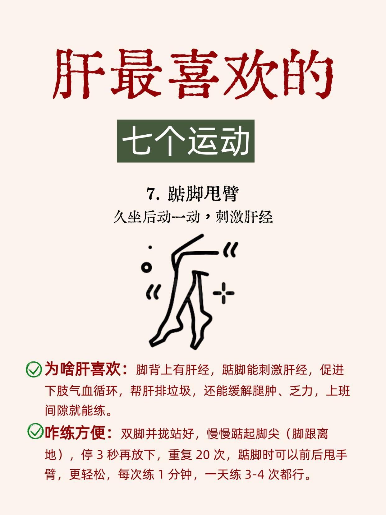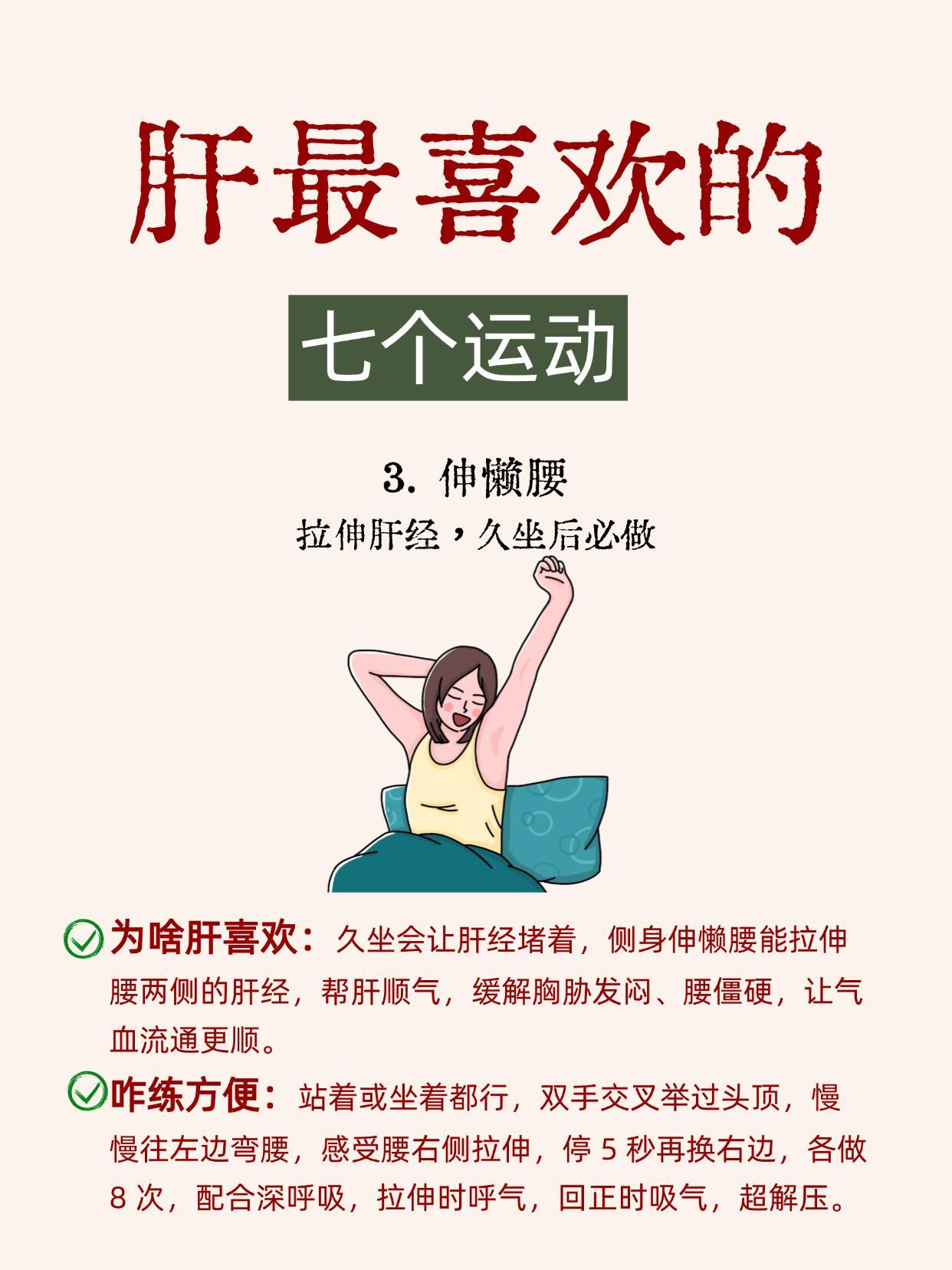 肝最喜欢的7个动作:1、散步2、按揉太冲穴 3、伸懒腰4、梳头5、腹式呼吸6、转