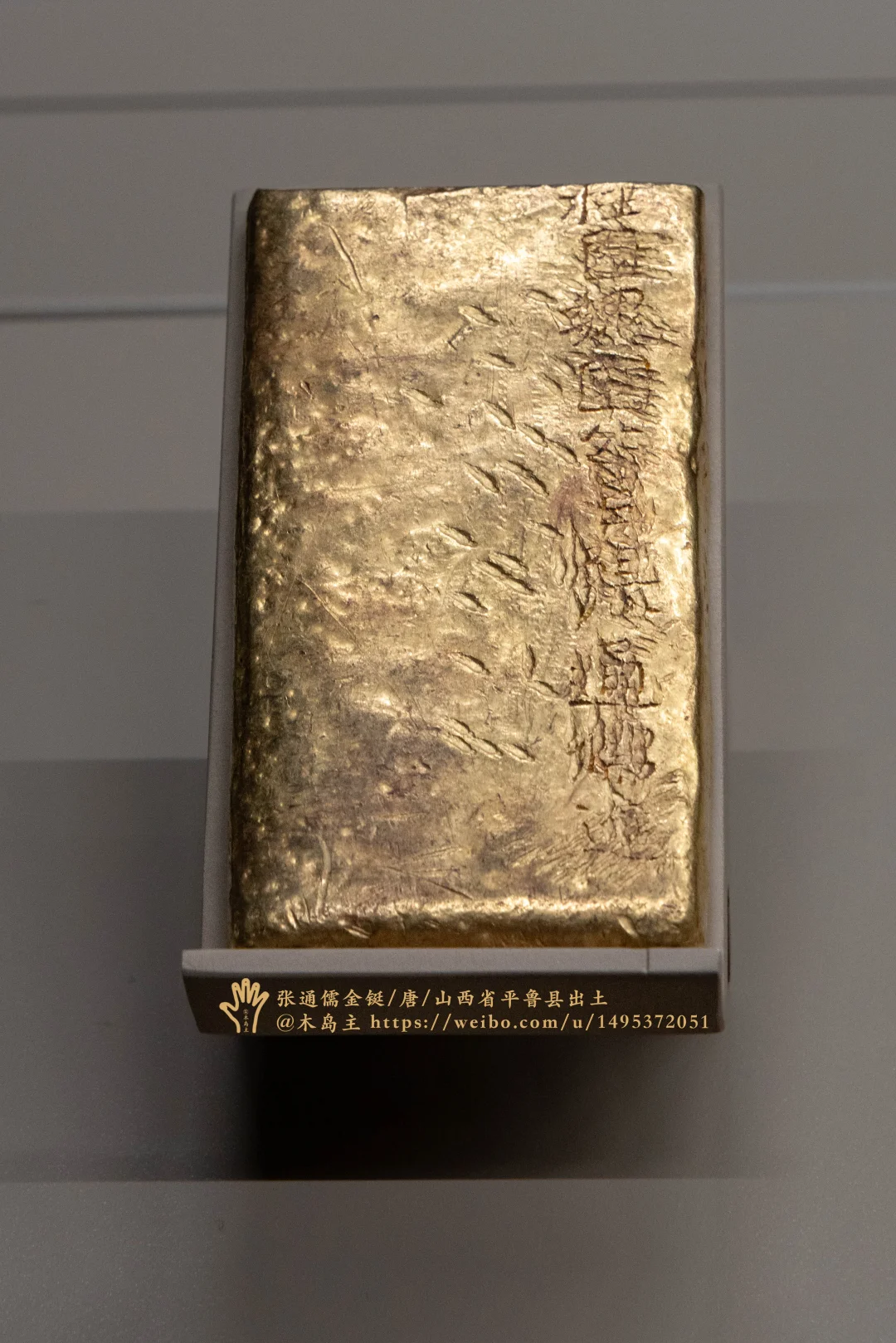 唐朝平安史之乱时,这件金铤很可能作为叛乱分子的财物没入官府,或在回纥人掠夺东、西二京时被抢掠而去。因此金铤上面“柱国魏国公张通儒进”等字被錾去,以表示金铤已改易主人。”