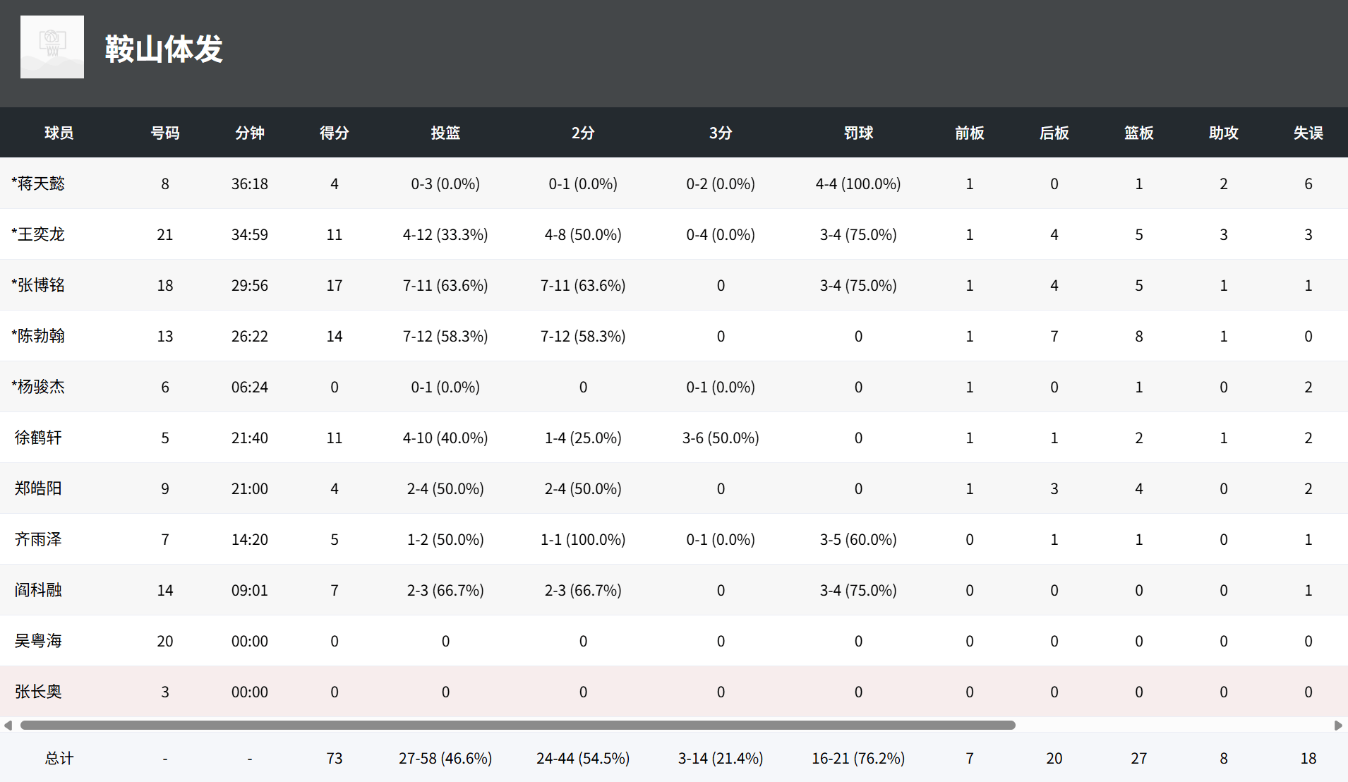 鞍山体发:张博铭17分、陈勃翰14分8篮板、王奕龙11分