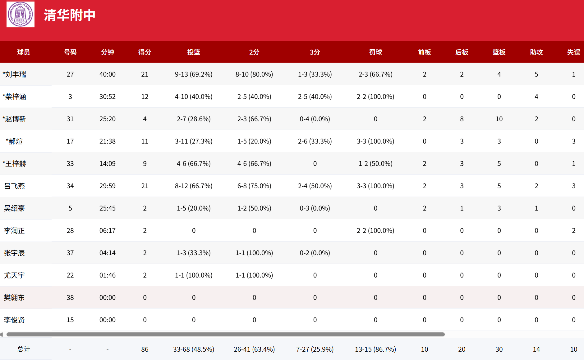 清华附中:吕飞燕21分、刘丰瑞21分、柴梓涵12分