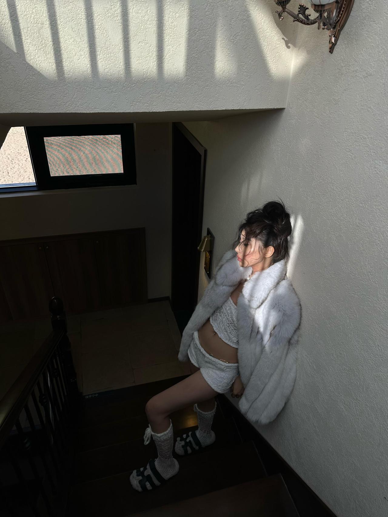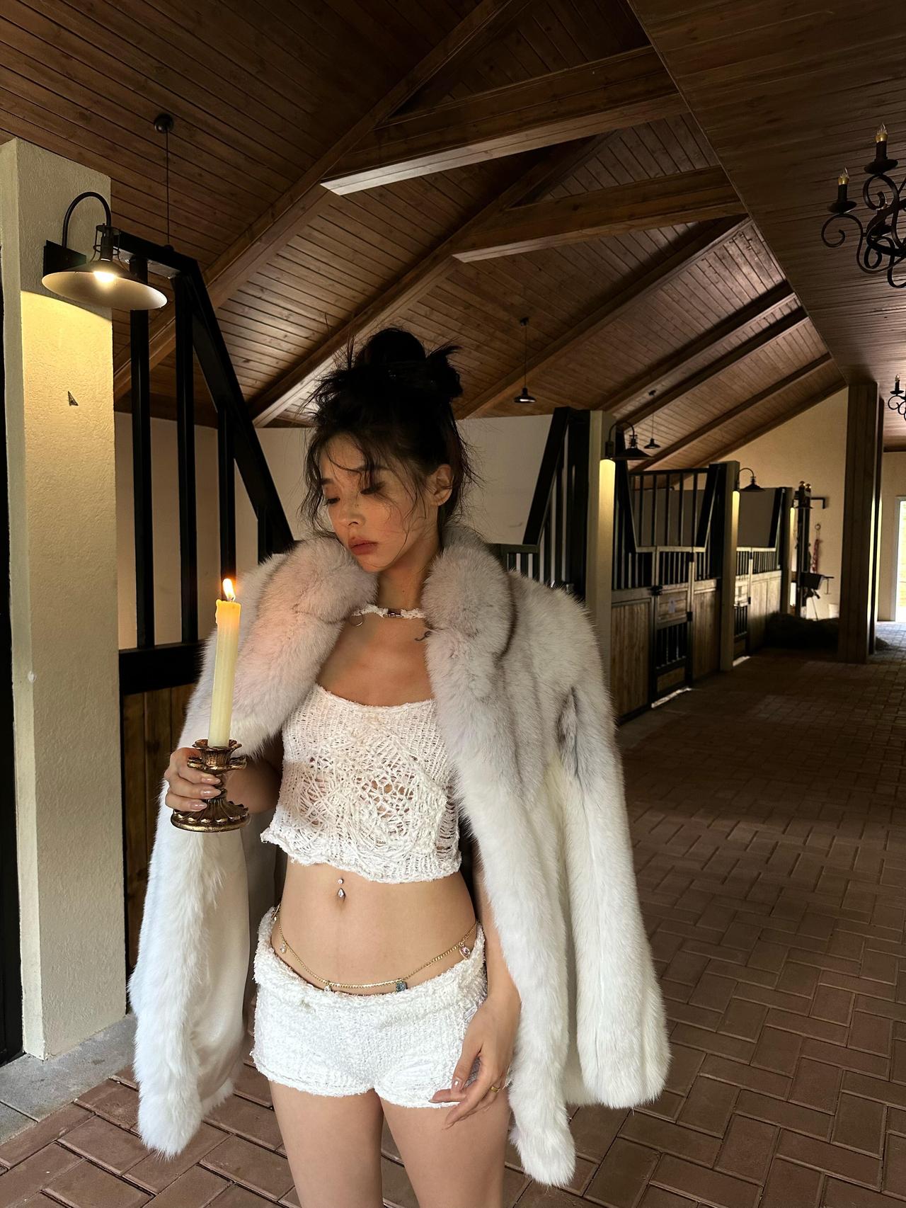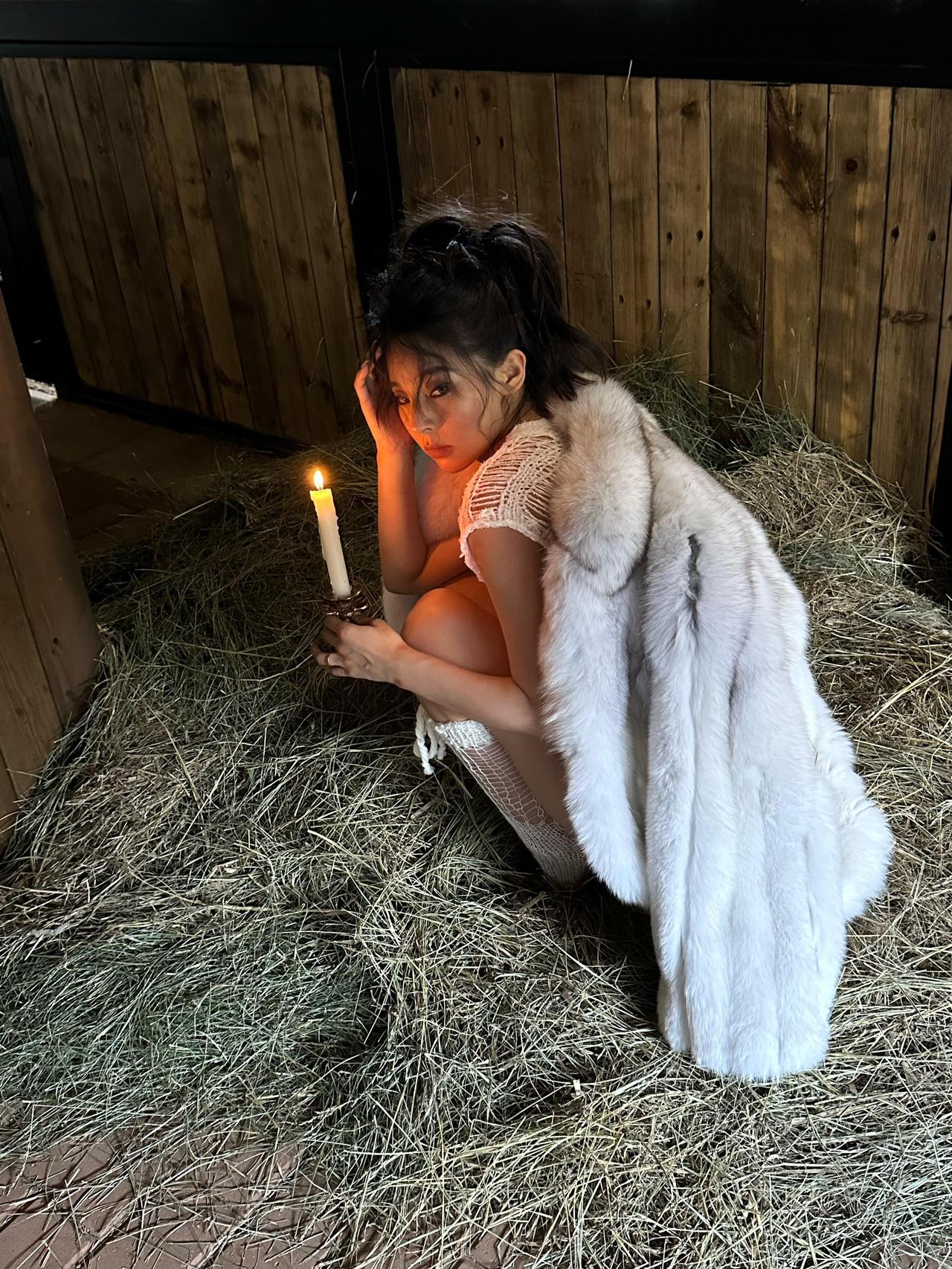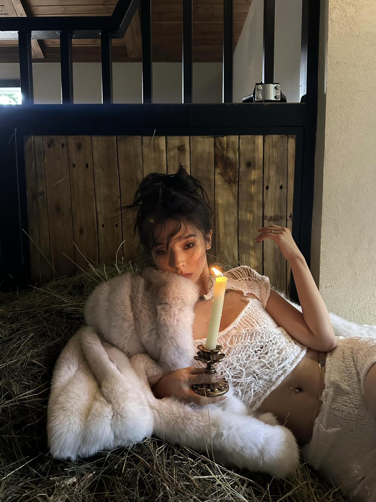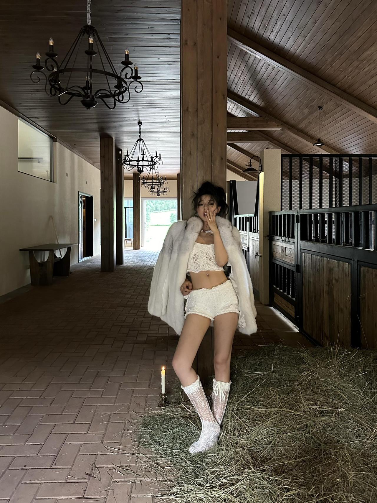 这组摄影作品以空间为画布,通过场景的跳转与材质的强烈对比,构建出极具戏剧感的视觉画面。在楼梯场景中,深色木质台阶的沉稳与白色皮草的奢华形成第一重反差,模特裸露的肌肤与蕾丝长袜的精致又构成第二重张力,角落的烛火则为冷调空间注入暖昧情绪,将私密空间的孤寂与时尚表达的张扬巧妙糅合。 马厩场景的运用更是点睛之笔,木质结构的粗犷、干草的原始与皮草的华贵、蕾丝的细腻形成硬核反差。模特在马厩立柱、干草堆间的姿态,打破了人们对时尚摄影场景的常规认知,把本应属于高级时装秀场的元素,放置在充满生活质感甚至略带“粗粝感”的马厩里,这种空间的“错置”让时尚不再悬浮,反而因场景的真实感而更具冲击——就像把钻石扔进麦堆,光泽依旧却多了几分野生的魅惑。 每一张照片里的烛火都是情绪的锚点,它的暖光在冷调的场景、冷感的材质(皮草、木质、砖石)中撕开一道温柔的口子,既串联起不同场景的视觉逻辑,又为叛逆的表达包裹上一层诗意的朦胧,让整个系列在“冲突”之上,多了层可供回味的情绪深度。