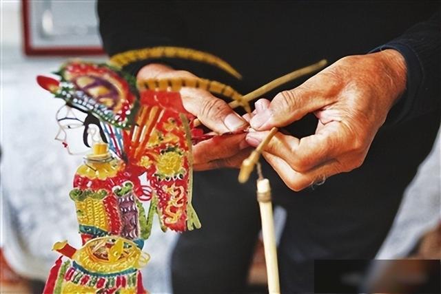 镂刻完成后,便是敷彩。色彩搭配讲究鲜明生动,既能凸显人物性格,又能在灯光下呈现出极佳的视觉效果。上色后还要熨烫平整,最后将皮影的头、臂、手、上身、臀部、腿部等部件组装起来。