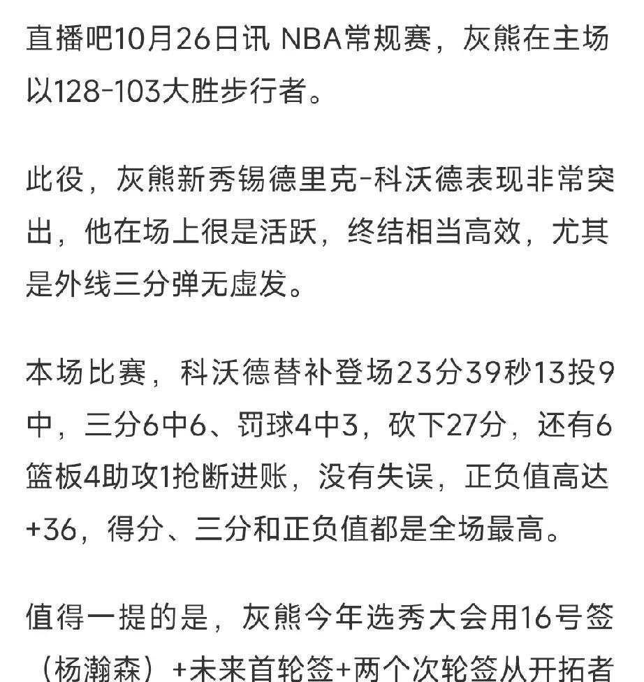 用杨瀚森+3个签换的11号秀,爆砍27分,开拓者后悔没? 刚刚结束的NBA灰熊对阵步行者的比赛,新秀科沃德砍下27分,其中三分球6中6,正负值+36。而这个科沃德就是灰熊用杨瀚森+3个签换来的,灰熊应该非常高兴,而开拓者不知道有没有后悔! 当然了,现在说这个还为时尚早,这才打了一两场比赛,最终成色还没有确定。