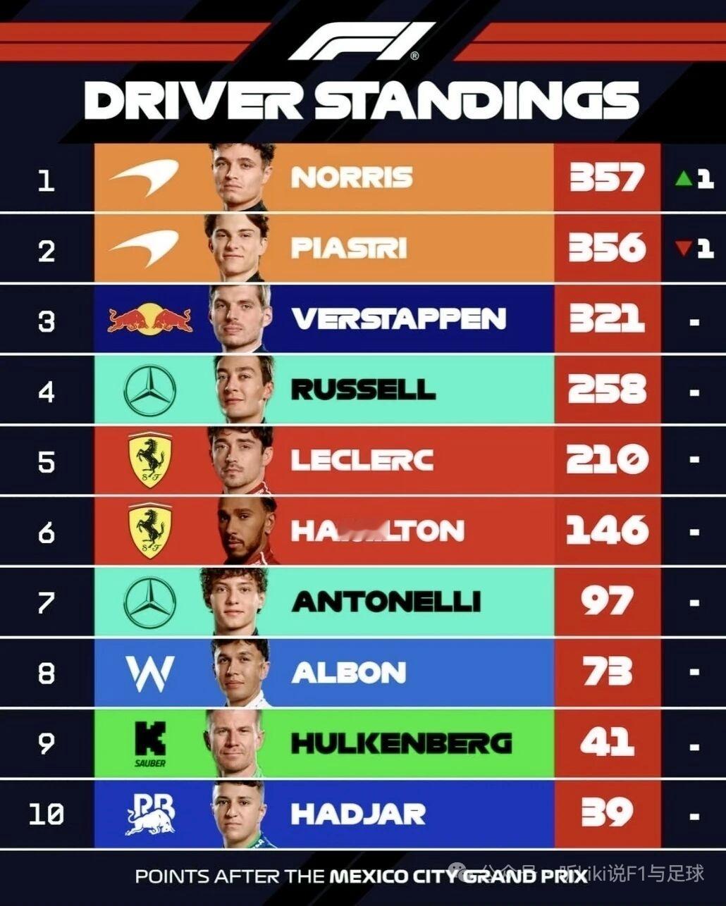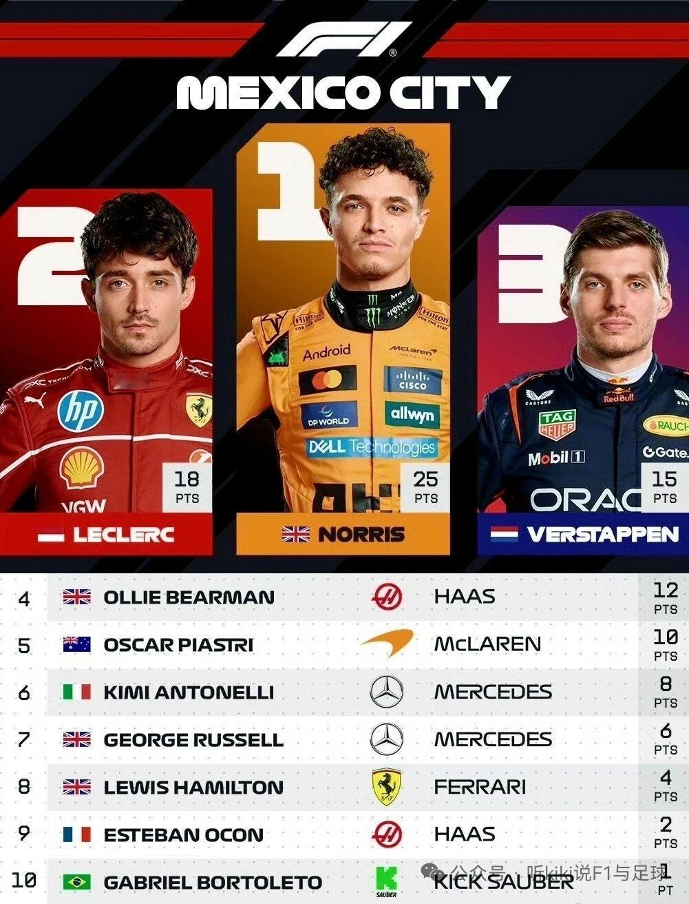 诺里斯赢得墨西哥城大奖赛正赛冠军!勒克莱尔亚军,维斯塔潘季军!诺里斯成为车手积分