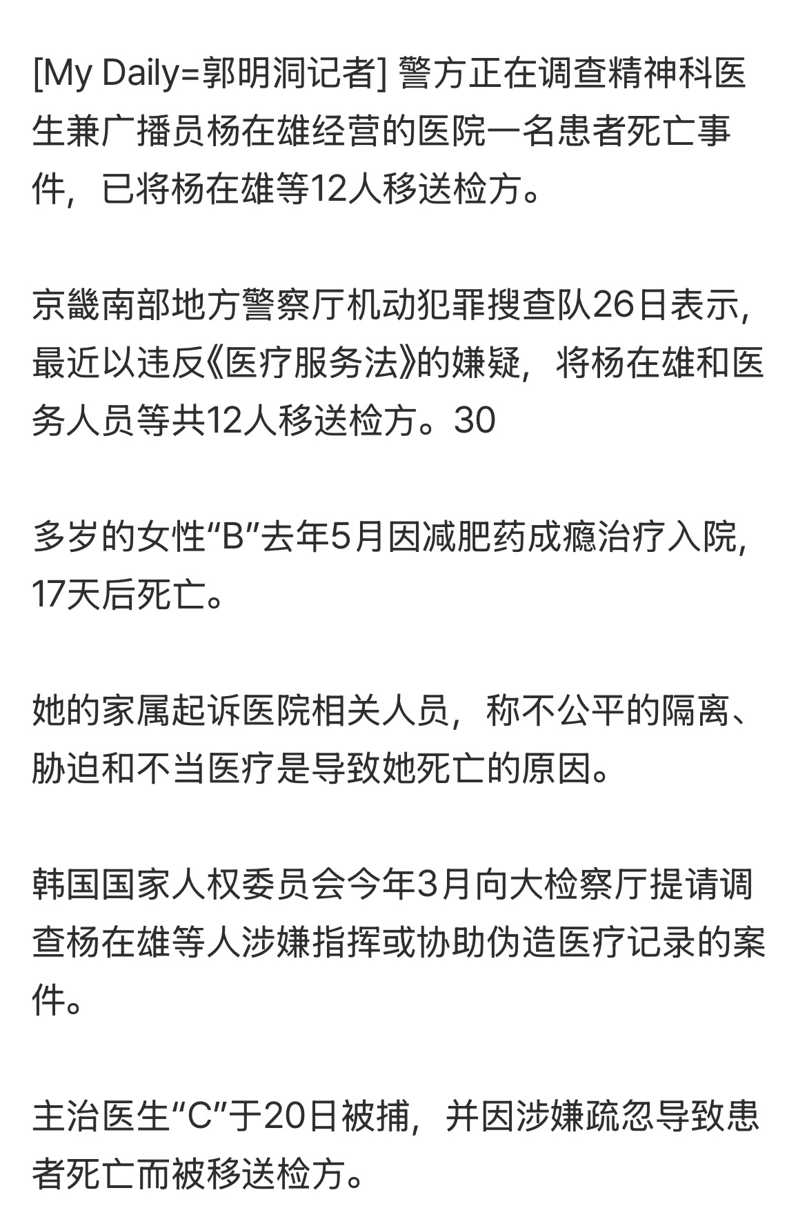 Hani未婚夫梁在雄因涉嫌违反《医疗法》等罪名被移交检方,预计检方将针对医院整体系统是否存在过失,展开严格调查。