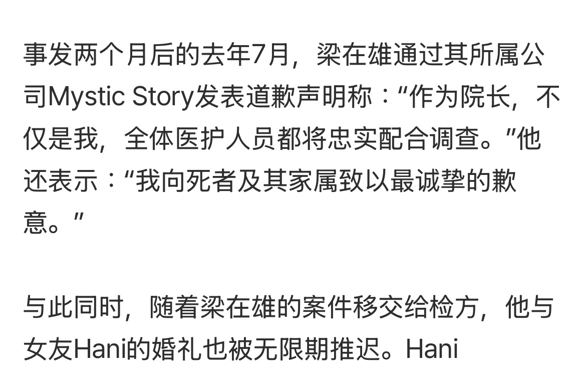 去年5月梁在雄经营的医院发生患者死亡事故,家属起诉称不公平的隔离、胁迫和不当医疗是导致患者死亡的原因。他与Hani原定去年9月举行的婚礼无限期推迟。