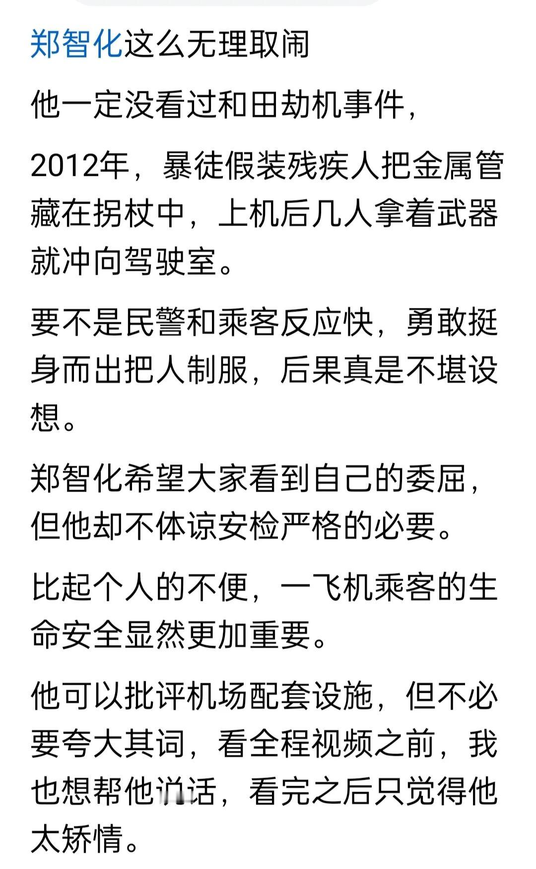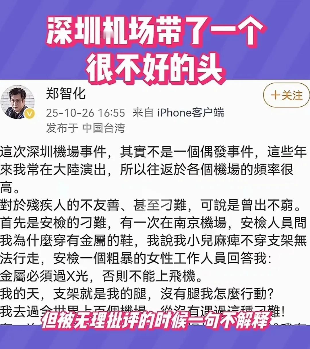 郑智化早有退圈之意,深圳机场借机生事有损身残志坚励志歌手形象 言为心声! 从郑智化的发文,便能知晓其内心的真实意图。 这原本只是一场因沟通不畅引发的小事,却被郑智化闹大。在此事当中,郑智化与深圳机场双方都有处理不当的地方,而他单方面指责机场方,实在是无理取闹,颇有借机生事之嫌。 郑智化不仅指责深圳机场,还翻出多年来在大陆机场遭遇的种种“刁难”,埋怨大陆对他不好。 看了郑智化的发文,我不禁涌起一种熟悉之感,这不就是人们常说的“养了一只白眼狼”吗! 郑智化凭借在央视演唱歌曲《水手》声名鹊起,进而打开大陆市场。多年来,他凭借《水手》、《星星点灯》塑造了身残志坚的励志歌手形象,在大陆赚得盆满钵满。 “端起碗吃肉、放下碗骂娘”,再恰当不过的刻画了郑智化多年来在大陆的演艺历程。这不是个例,正如台湾主持人柳杰克在其节目中揭示的台岛一些人这种扭曲心理,那是一种现象! 至于郑智化,退不退圈那是他个人的选择,歌手多的是,但关乎他的个人形象是不是也应该“退圈定论”了?