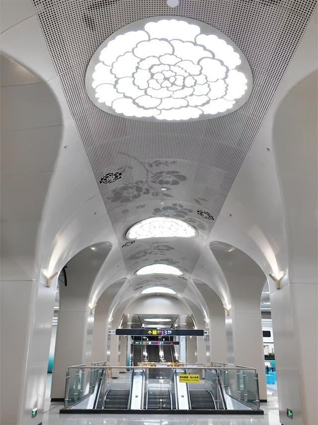 步入新南门站,连续的拱形结构唤起对古城门的记忆;天花板上芙蓉造型花灯,宛若繁星点点;两侧墙面青蓝渐变如锦江波光,整体氛围简约现代而不失古典韵味。“这个车站毗邻成都旅游集散中心,是大量游客开启天府之旅的‘第一站’,它不仅是交通枢纽,更是展现城市文化的一扇窗口。”本站装修设计负责人严学波介绍,“我们在设计上融入了芙蓉花、古城门、锦江等元素,希望每一位乘客踏入这座车站就能感受到成都独有的韵味。”