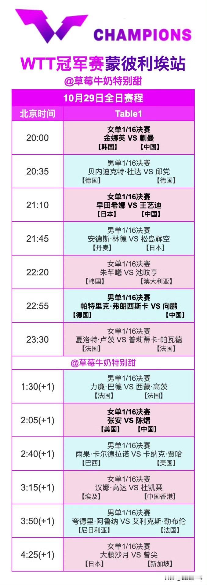 10月29日全日赛程P2 国乒赛程如下: 20:00 T1 蒯曼🇨🇳VS金娜英🇰🇷 21:10 T1 王艺迪🇨🇳VS早田希娜🇯🇵 22:55 T1 向鹏🇨🇳VS帕特里克·弗朗西斯卡🇩🇪 2:05(+1) T1 陈熠🇨🇳VS张安🇺🇸