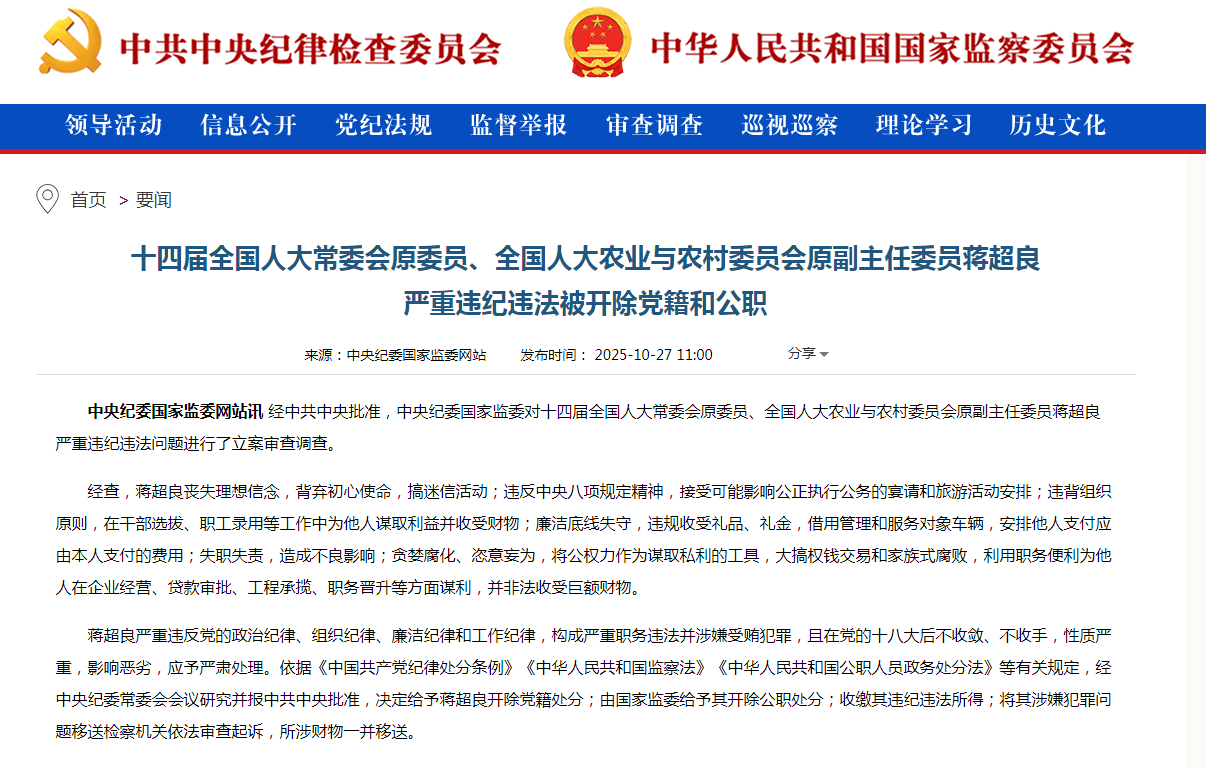 蒋超良严重违反党的政治纪律、组织纪律、廉洁纪律和工作纪律,构成严重职务违法并涉嫌受贿犯罪,且在党的十八大后不收敛、不收手,性质严重,影响恶劣,应予严肃处理。依据《中国共产党纪律处分条例》《中华人民共和国监察法》《中华人民共和国公职人员政务处分法》等有关规定,经中央纪委常委会会议研究并报中共中央批准,决定给予蒋超良开除党籍处分;由国家监委给予其开除公职处分;收缴其违纪违法所得;将其涉嫌犯罪问题移送检察机关依法审查起诉,所涉财物一并移送。