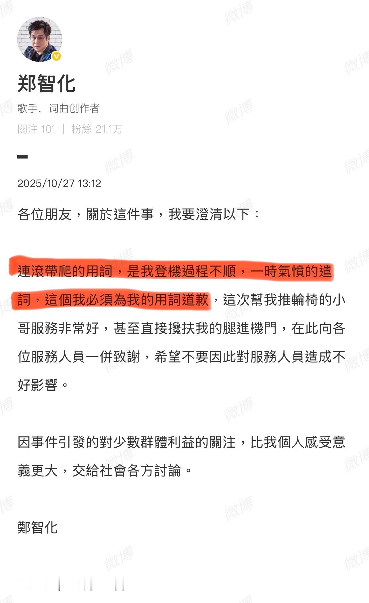 得亏是有监控,不然深圳机场白背锅了,服务有改进空间,但不至于一无是处![流汗][流汗][流汗]郑智化 没有连滚带爬郑智化致歉 郑智化称连滚带爬是气愤遣词