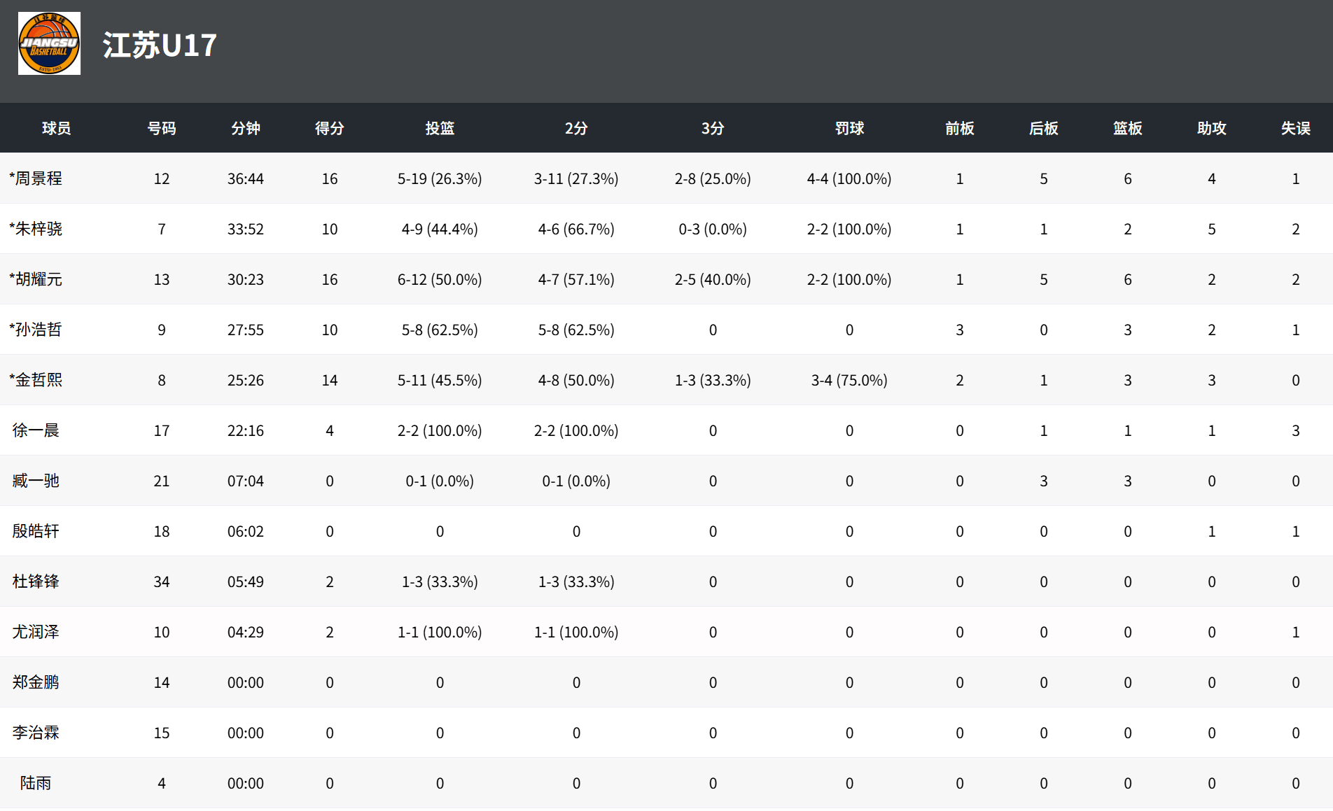 江苏U17:周景程16分、胡耀元16分、金哲熙14分