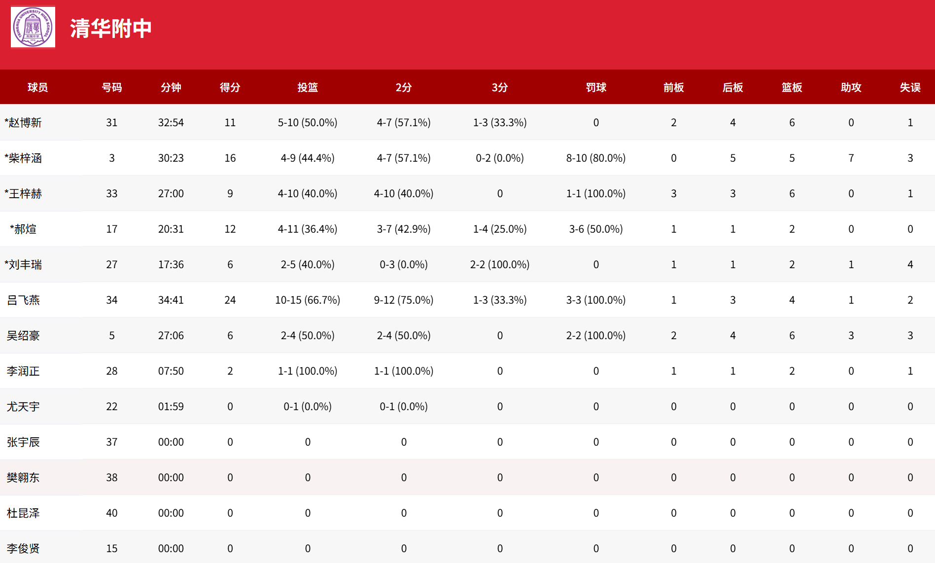 清华附中:吕飞燕24分、柴梓涵16分7助攻、郝煊12分