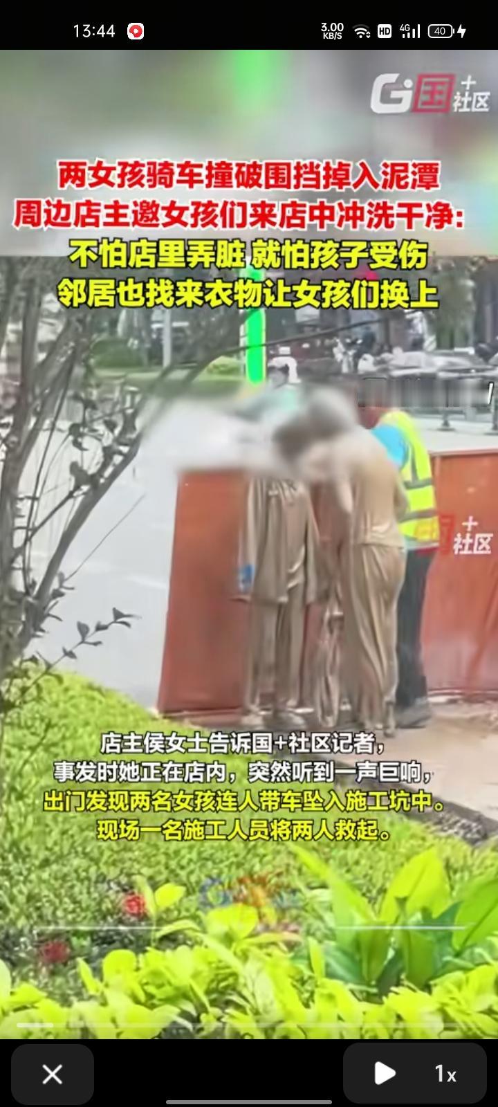 10月26日,海南五指山。两女孩骑车时撞破围挡,连人带车坠入施工坑中,现场一位施工人员将两女孩就去。周边店主见状请两女孩进店里洗澡,并称“不怕弄脏,就怕孩子受伤”,邻居也找来衣物给两女孩换上,最后两女孩被家长接走。