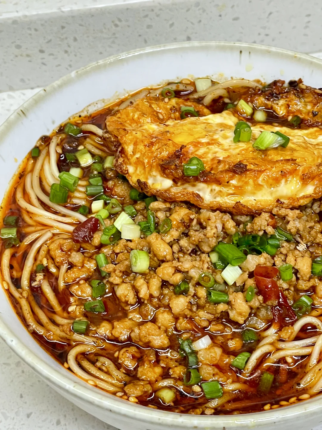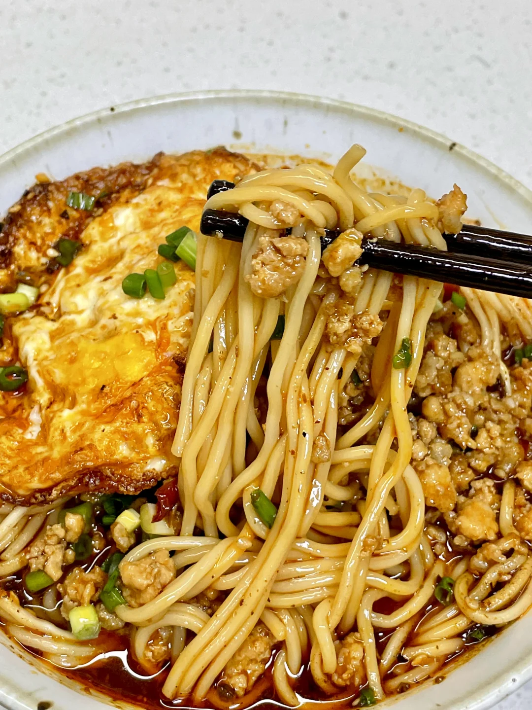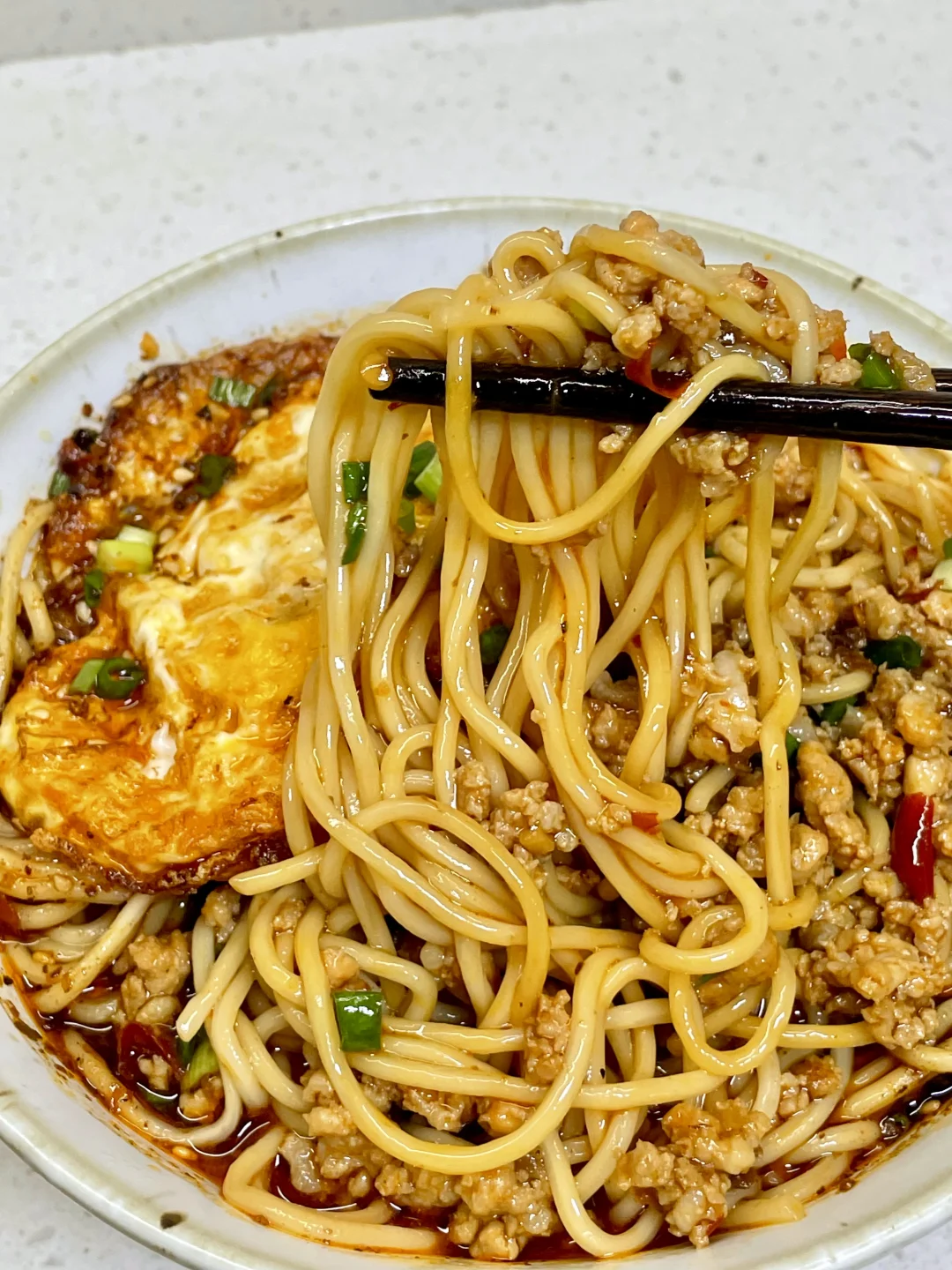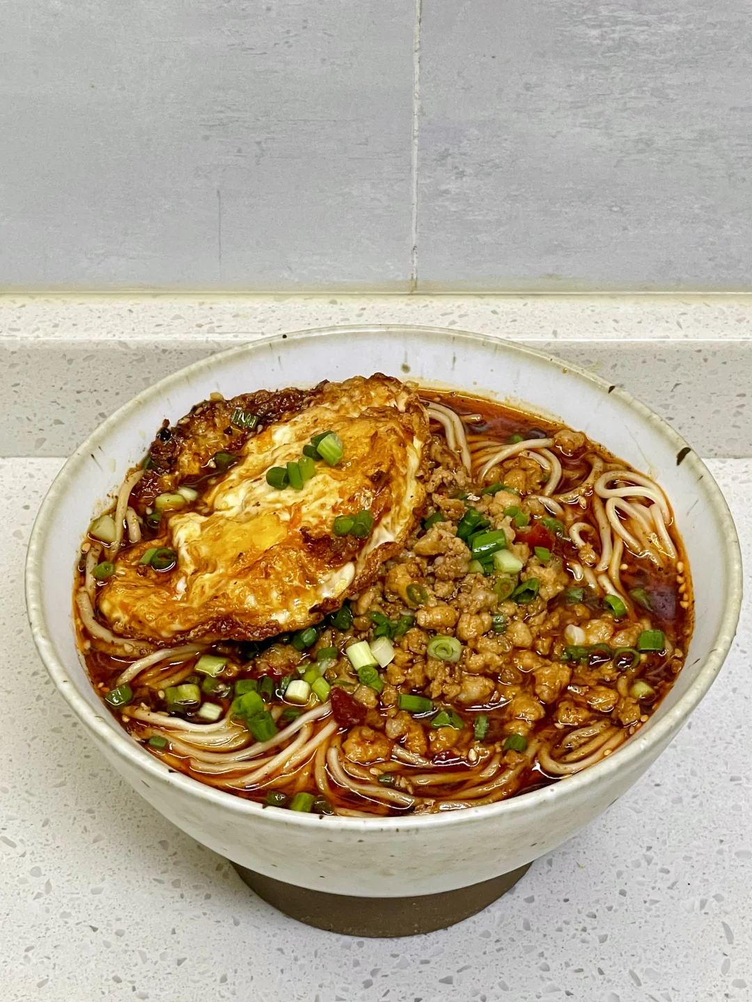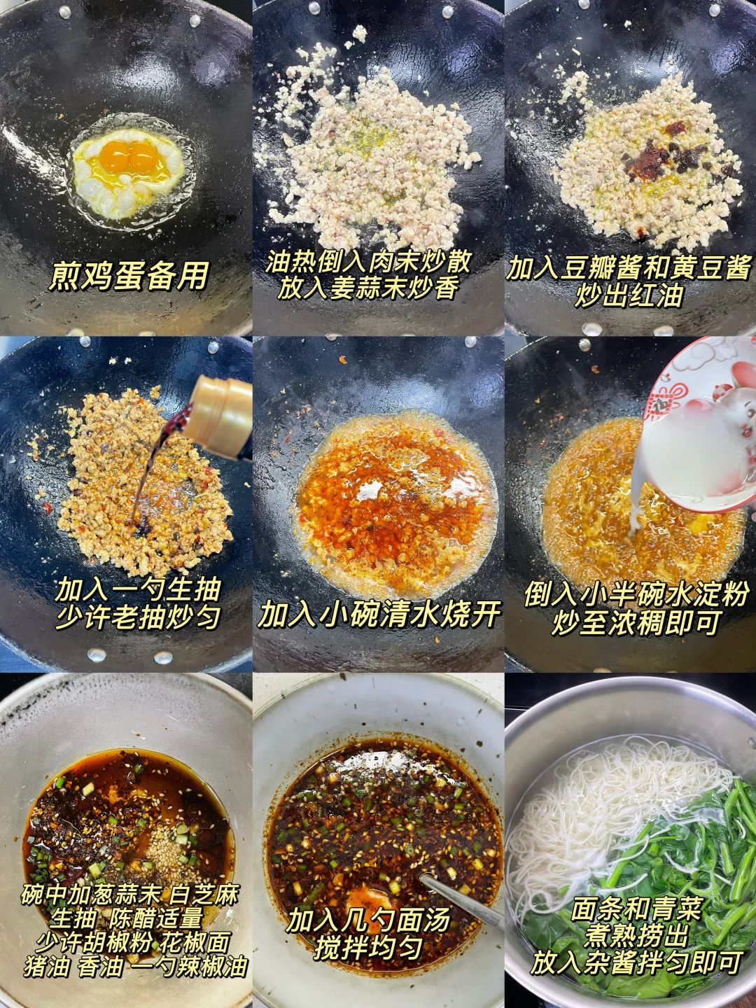 香迷糊的杂酱面,重庆人是真的离不开这碗面,自己在家也能复刻出面馆的味道,自己炒料更健康,杂酱随便加,吃得更过瘾 1⃣️:锅中油热倒入肉末炒变色,放入姜蒜末炒香,加入豆瓣酱 黄豆酱炒出红油,加入一勺生抽 少许老抽炒匀,倒入适量清水烧开,再加入水淀粉炒至浓稠备用 2⃣️:调料:葱花 蒜末 白芝麻 生抽 陈醋 胡椒粉 花椒面 少许盐 鸡精 香油 少许猪油 一勺辣椒油,加入适量开水搅拌均匀 3⃣️:水开放入面条和青菜煮熟捞出放入碗中,淋上杂酱臊子,撒上葱花拌匀即可