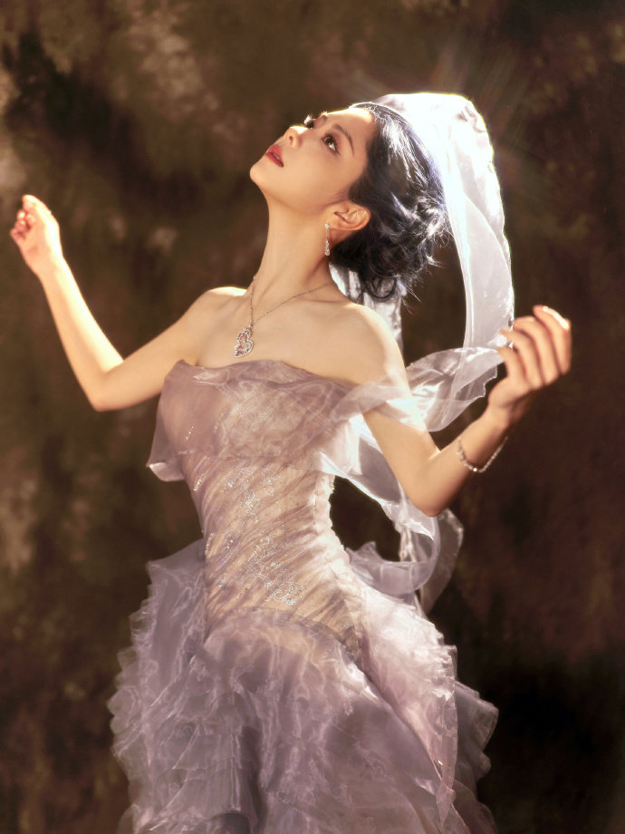 谭松韵紫色抹胸纱裙 谭松韵紫色抹胸纱裙,像是从油画中走出来的美人啊~