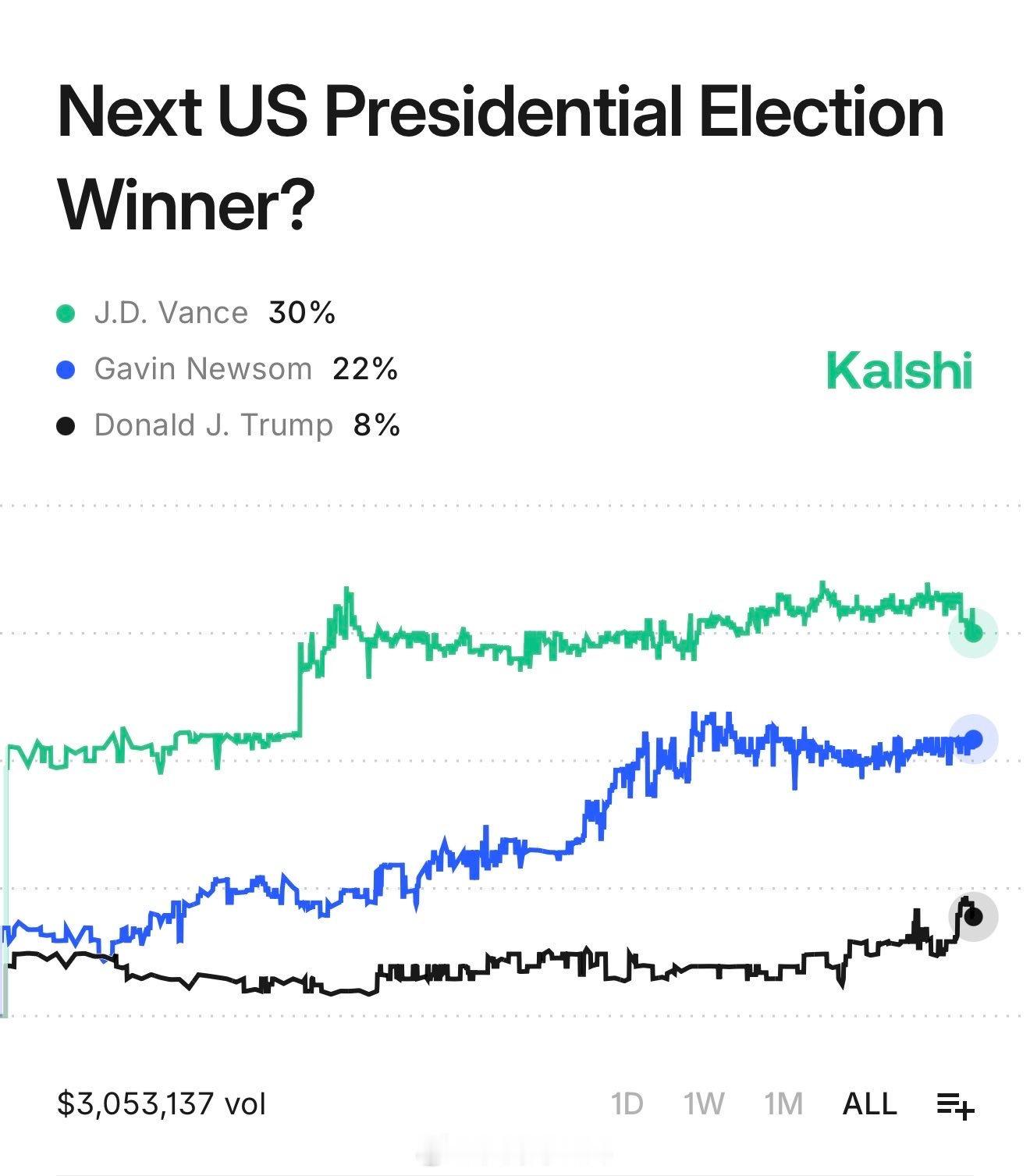 纽森表示有意在2026中期选举后竞选总统,著名投注网站给出了纽森的实时获胜概率加