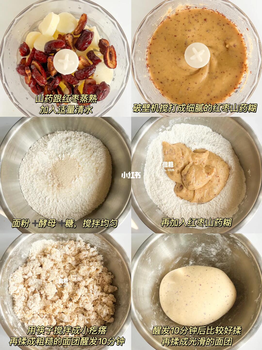 200克熟山药,55克熟红枣,95克水,400克面粉,3.5克酵母,10克白糖(可不加)