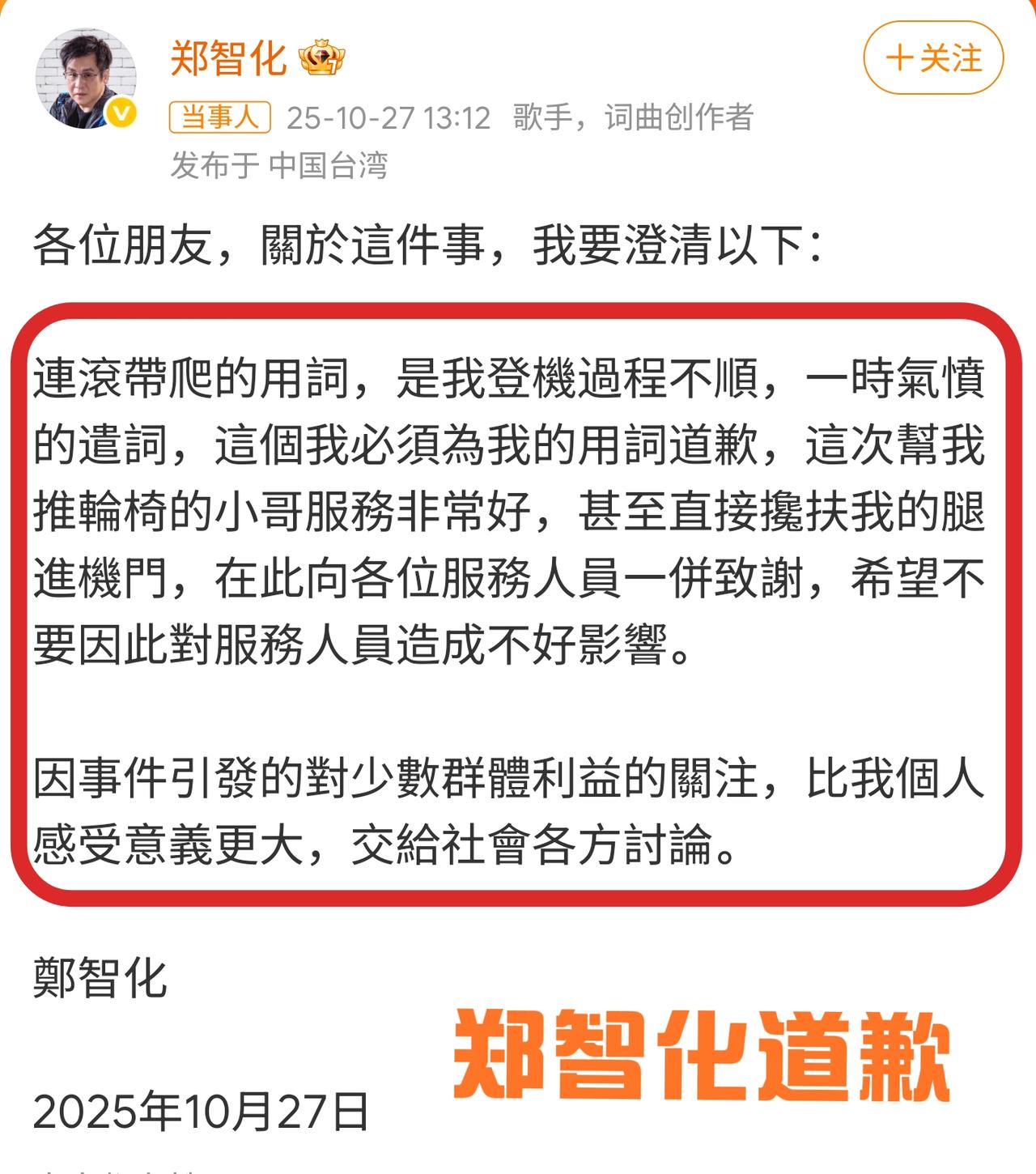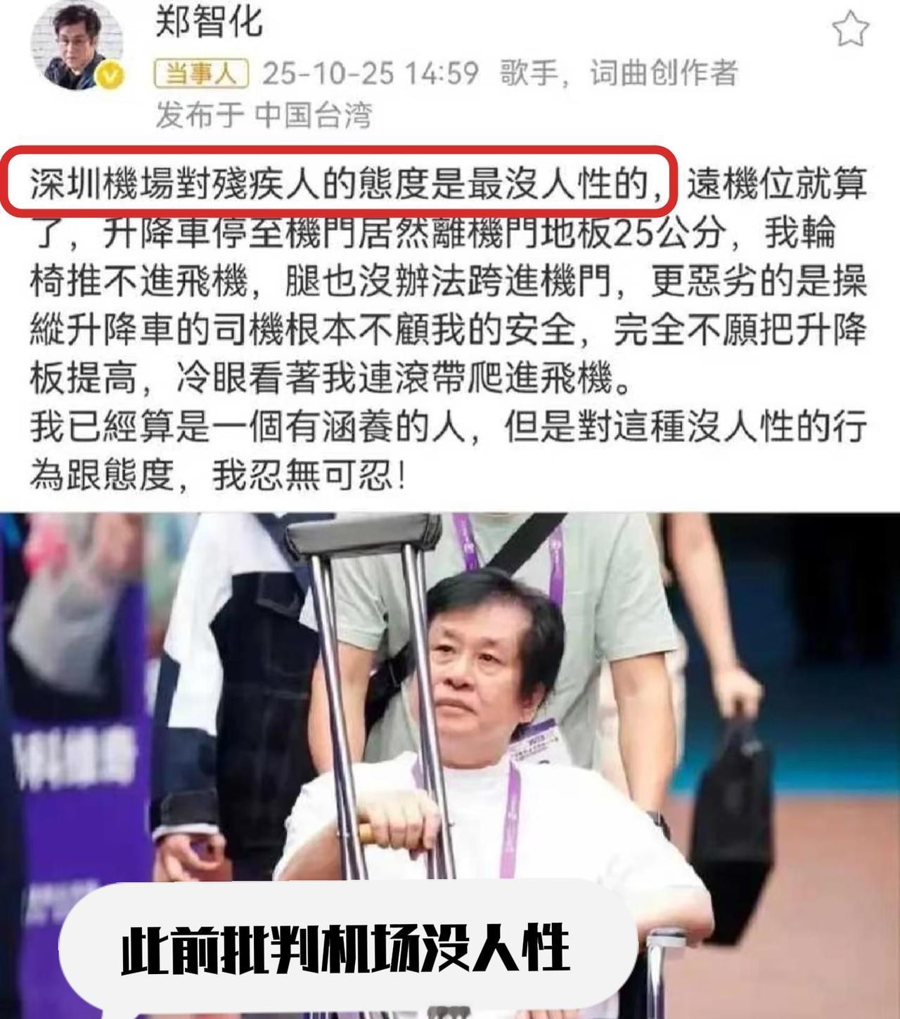 郑智化"连滚带爬"的登机吐槽,出现大反转了[灵光一闪]!本来他是想维护残疾人权益,谁知监控视频放出来了。根据监控画面显示,机场两名地勤全程贴身陪护,扶他过台阶进舱,并无他描述的那么狼狈[笑哭]。 随后郑智化公开发文致歉,承认此前表述存在不当。他这波"小题大做",让机场人员挺委屈的。我承认现阶段在国内,保障残障人士的设施,是比不上发达国家[灵光一闪]。 但他把别人的尽力协助,说是对他的"故意刁难",甚至上升到"没人性",这就有点说不过去了。你说他的这种心态,是不是也该反思一下呢?欢迎评论区说下你的看法。