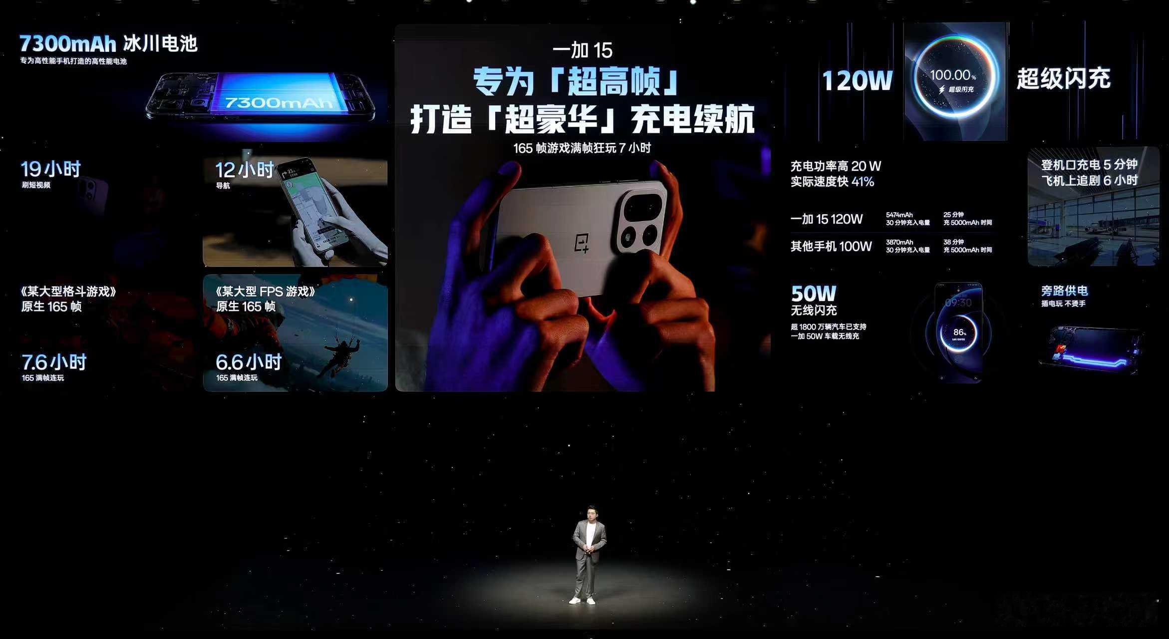 一加 15 续航方面搭载:7300mAh 冰川电池+ 120W 超级闪充,还支持 50W 无线闪充,与超大电池、超快闪充共同构成了一套全面顶满的豪华充电续航组合。一加15和Ace6新品发布一加15