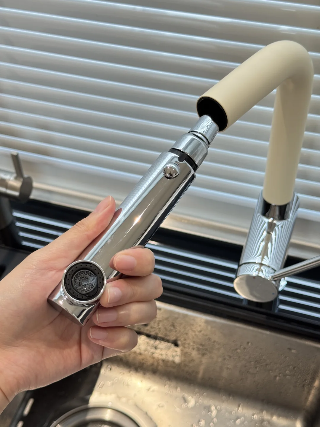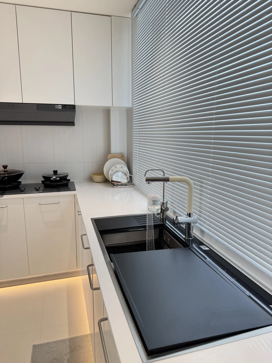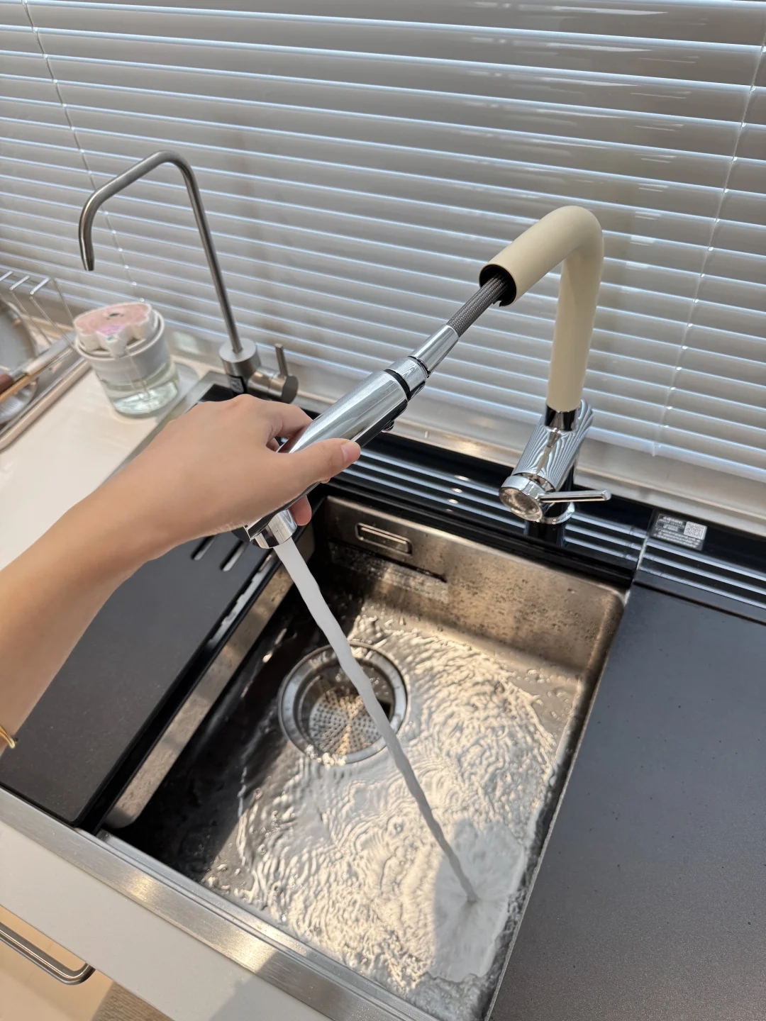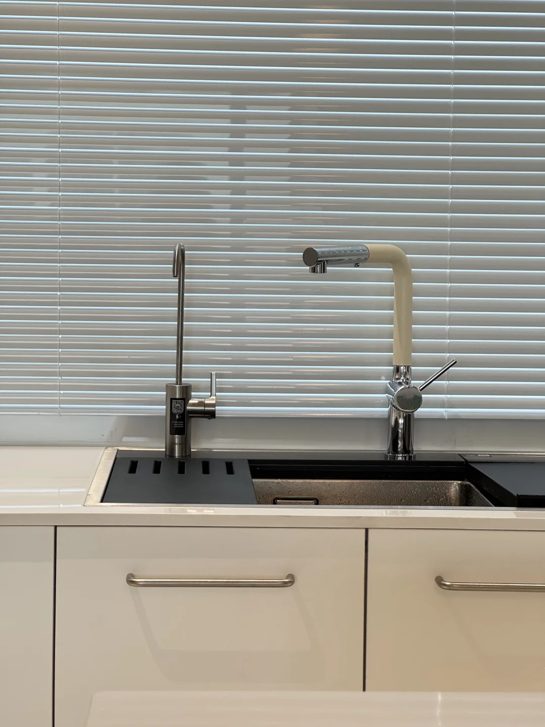 之前洗碗机自带的水龙头不太好用 近期给水槽新换了水龙头,简直太貌美了 L型我觉得更时尚高级 水龙头全铜材质很扎实 一只手都有些拿不动 奶白色磨砂质感不容易留水渍 是很高级的白越看越好看 抽拉式两种出水模式 洗东西也不溅水[萌萌哒R] 简直和我家厨房太配了 大家觉得怎么样呢~~