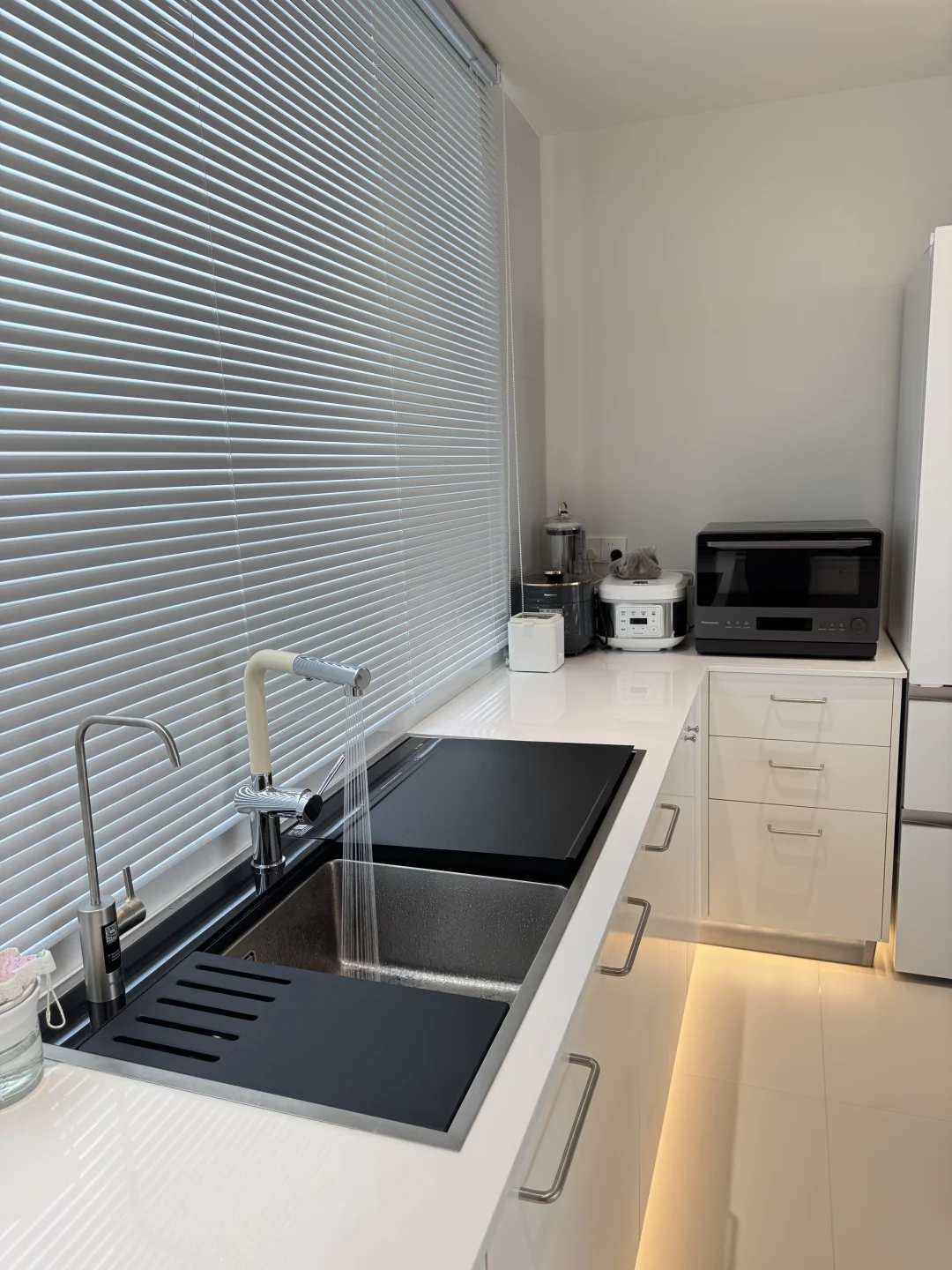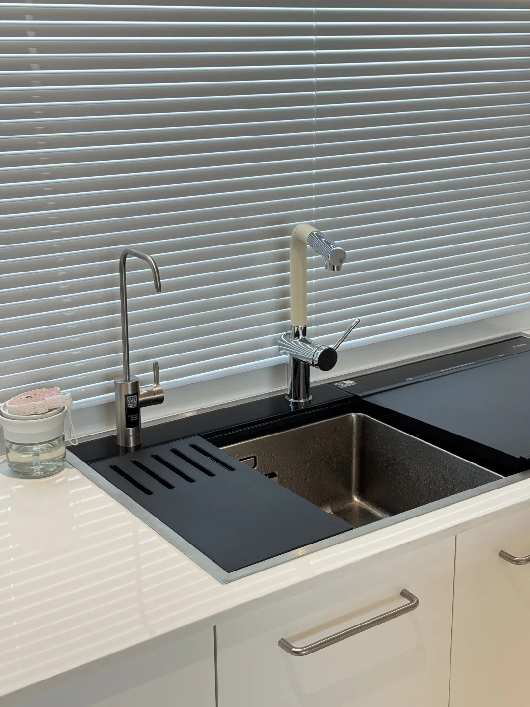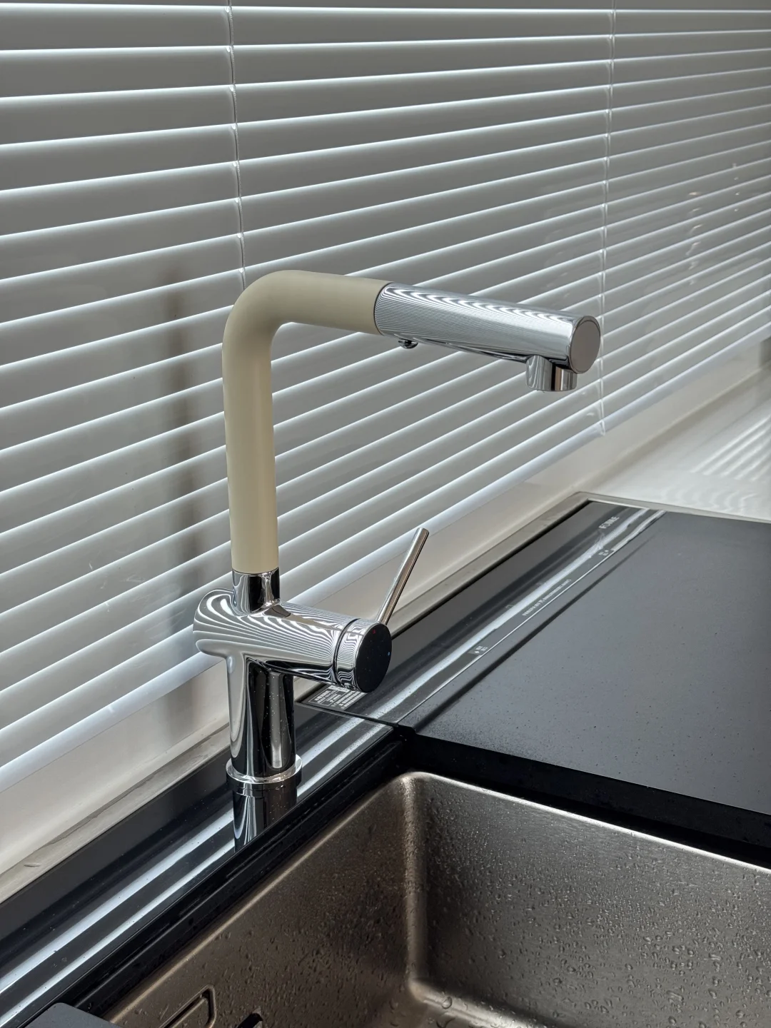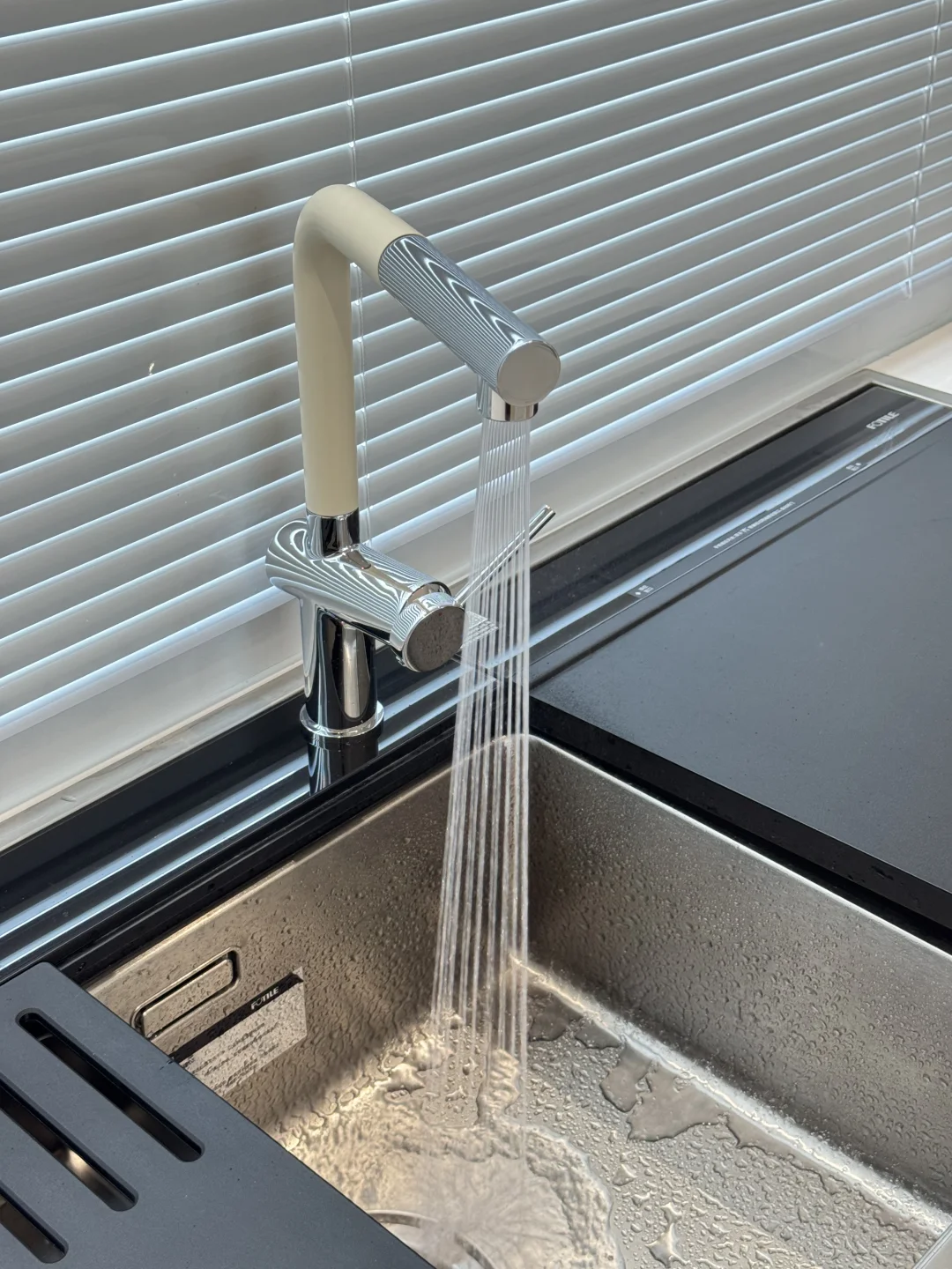 之前洗碗机自带的水龙头不太好用 近期给水槽新换了水龙头,简直太貌美了 L型我觉得更时尚高级 水龙头全铜材质很扎实 一只手都有些拿不动 奶白色磨砂质感不容易留水渍 是很高级的白越看越好看 抽拉式两种出水模式 洗东西也不溅水[萌萌哒R] 简直和我家厨房太配了 大家觉得怎么样呢~~