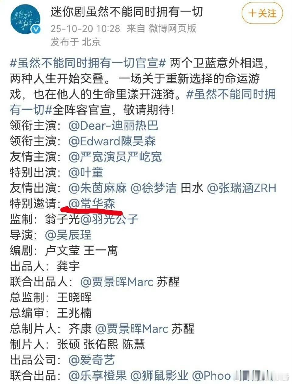 常华森是李一桐《美人余》男主和迪丽热巴《虽然不能同时拥有一切》男主,轧戏这么明目张胆吗