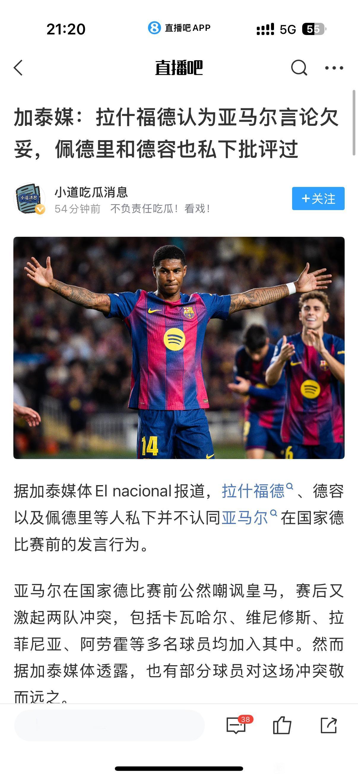 连拉什福德都觉得亚马尔言论不妥,这可是曼联的暗黑天王啊! 但是拉什福德在巴萨还是很乖,不会有这样的冲突,他在曼联也不会攻击利物浦,骂阿森纳的。 所以亚马尔真的做错啦,向皇马道歉,在巴萨安生踢球吧,最近成绩不好,巴萨球迷都在骂了。[可怜]