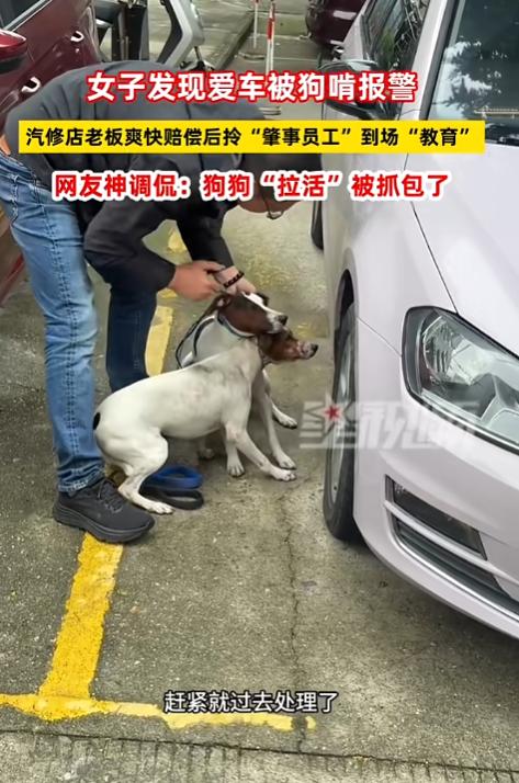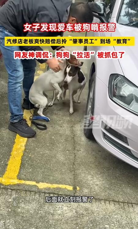 “笑不活了!”10月26日,江苏溧阳,一女子发现自己的爱车被狗啃立刻报警,邻居认出两条狗狗是汽修店老板养的,汽修店老板得知后爽快赔偿,随后亲自到场教训自家的“肇事员工”,网友:狗狗“拉活”被抓包了! 一女子接到邻居电话,对方称她停在楼下的车被狗咬了,女子有点不敢相信,赶忙下楼查看, 发现真的有两条狗狗在啃咬自己的汽车。 女子仔细检查车辆,损伤有些严重,被狗啃咬过的地方都出现了凹陷,她有些生气,这两条狗都戴着项圈,一看就是人养的,于是女子果断报了警。 邻居认出了这两条狗,正是汽修店老板养的,汽修店老板在得知情况后向女子道了歉,并爽快表示自己一定会赔偿。 和女子协商完赔偿后,汽修店老板来到现场逮捕了“肇事员工”,拎起两条狗狗的后脖颈一顿胖揍,被教训的狗狗们一动也不敢动,早就没有了刚才啃车的威风,老老实实低着头,蹲坐在地上挨巴掌。 网友调侃这两条狗狗本想给自家汽修店拉活,没想到被人现场抓包了,这下好了,活没拉成,还让主人赔偿了一笔钱,不挨顿揍都说不过去! 信息来源:《女子发现爱车被狗啃报警,汽修店老板爽快赔偿后,拎“肇事员工”到场“教育”,网友神调侃》星视频