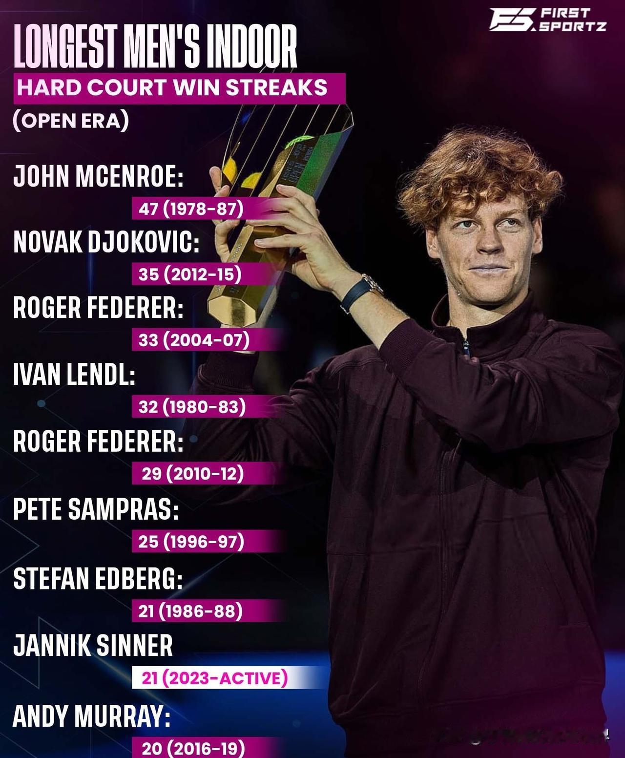 公开赛时代男子网坛室内硬地赛最长连胜纪录: 1、🇺🇸约翰·麦肯罗:47场 (1978-1987) 2、🇷🇸诺瓦克·德约科维奇:35场 (2012-2015) 3、🇨🇭罗杰·费德勒:33场 (2004-2007) 4、🇨🇿🇺🇸伊万·伦德尔:32场 (1980-1983) 5、🇨🇭罗杰·费德勒:29场 (2010-2012) 6、🇺🇸皮特·桑普拉斯:25场 (1996-1997) 7、🇸🇪斯蒂芬·埃德伯格:21场 (1986-1988) 8、🇮🇹扬尼克·辛纳:21场 (2023-现役) 9、🇬🇧安迪·穆雷:20场 (2016-2019) 扬尼克·辛纳凭借在维也纳的胜利为他赢得了一项新纪录,超过了安迪·穆雷的20场室内硬地连胜纪录,排在公开赛时代第八位。