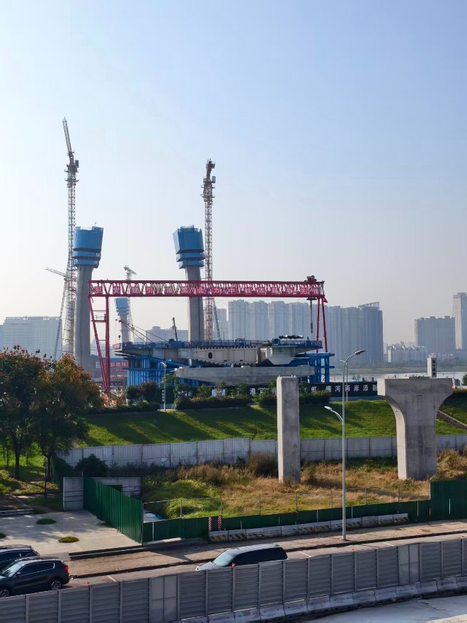 安徽建工水利蚌埠市延安路大桥及接线工程项目部现场负责人陈建坤介绍,延安路大桥全长2733米,主跨420米,是目前淮河流域主跨最大的双塔斜拉桥,造型融入“蚌型”意象,是蚌埠“拥河发展”战略的重要工程。目前已进入主桥面钢箱梁焊接安装阶段,北岸引桥已施工完工,正在进行路面施工,预计2026年贯通。