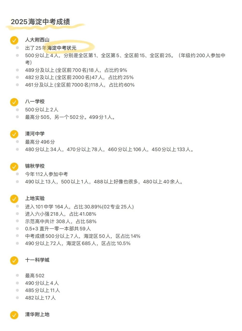 海淀43所初中校,中考捷报全盘点! 25改革后,海淀区 43 所初中最新中考成绩单出炉 ✨ 状元校 & 高分扎堆校,简直实力碾压 人大附西山出了 2025 海淀中考状元, 八一、人大附翠微再出捷报,505 分、502 分的高分直接断层领先。 多校 “500 + ” 牛娃扎堆,在海淀要卷进头部,不提前准备真的不行 🎯 示范高中 “入场券” 数据,择校瞄准升学命脉 上地实验进入六小强比例超 41%,示范高中占比 58%; 多校 490+、480 + 分段人数疯狂输出。比如师达中学 490 分以上 20 人左右、北航附中 470 分以上 100 人左右…… 不难看出,从中考角度而言,不同学校的力量确实有不同。评论区来唠唠,你家娃最想冲海淀哪所初中?👇 小升初 六年级 升学规划 择校 北京小升初 海淀 教育规划