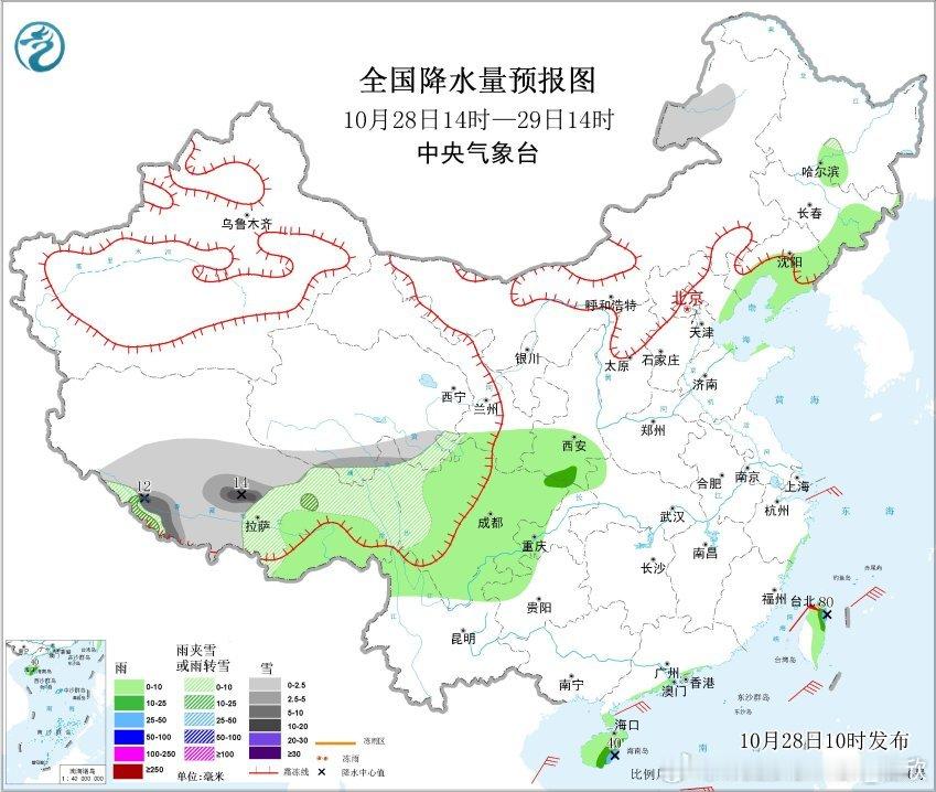 今天下午到明天中午,随着水汽继续输送上来,西藏四川等地降水会进一步增多,西藏部分地区可能有大雪-暴雪。另外在台湾东北部和海南岛东南部,偏东风叠加地形抬升,会导致有小范围的大雨,局地暴雨。