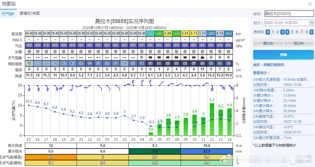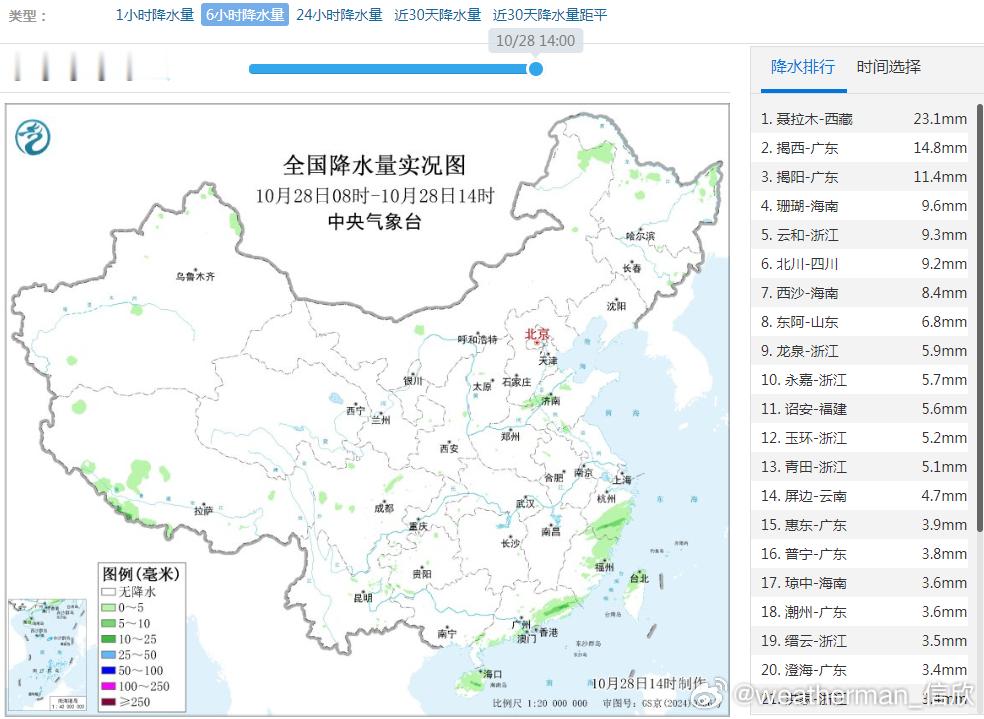 【降水】今天08-14时,我国总体的降水不多。从云图看,冷空气的偏东风,导致南方沿海出现阴雨,广东揭阳和揭西6小时雨量超20毫米。另外,阿拉伯海的扰动叠加高空槽向东北方输送水汽,导致我国西藏南部出现降水,聂拉木6小时降水量23.1毫米,雨雪混杂,11时积雪一度达到了11厘米,14时减少到5厘米。