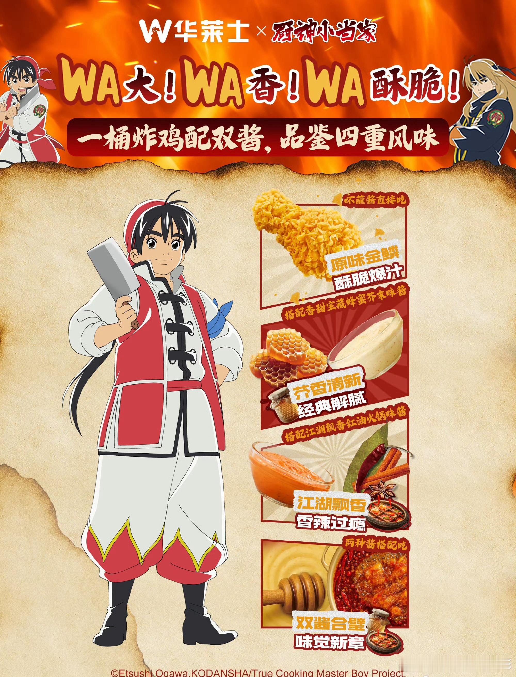 宝子们,童年动漫《厨神小当家》和华莱士炸鸡联名啦!25周年限定套餐上线,我秒冲“特级厨师香脆炸鸡桶”,一口炸鸡一秒穿回热血料理番时光~
