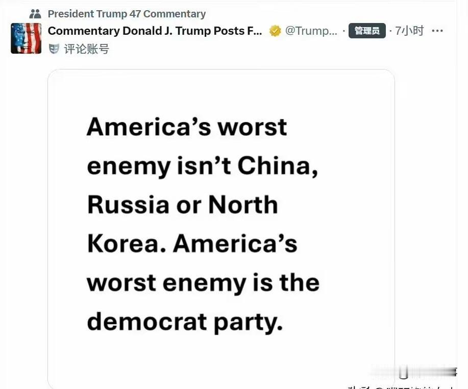 特朗普:宝宝郁闷啊!内部的敌人比外部的敌人更难对付! 近日特朗普疲劳的奔波于亚洲各国,闲暇之余还不忘发发牢骚、诉诉苦,在社交账号上发表了工作体会,“美国最大的敌人不是中国、俄 罗斯或朝鲜。美国最大的敌人是民主党。” 这句话看似扎心,其实道出了一个普遍的真理,对于个人而言,最大的挑战不是别人,而是自己的内心,对于一个家庭而言,最大的矛盾不是外部,而是家庭内部,家家都有本难念的经。对于一个国家而言,最大的敌人不是外部,而是是来自于国家内部。 外部矛盾好解决,文的不行来武的,各种手段都可以上,而内部则不一样,真是苦了宝宝啊!