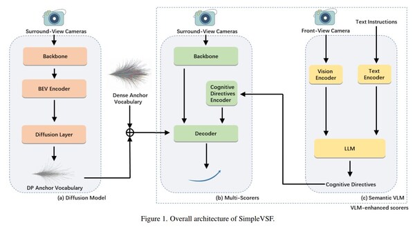 该框架采用扩散模型生成高质量的多样化候选轨迹,奠定规划基础;运用ViT-L等先进视觉骨干网络进行高效、鲁棒的环境特征提取,为下游任务提供可靠表征;并引入Qwen2.5VL系列视觉语言模型,利用其在场景理解与指令生成方面的语义优势,确保系统整体性能基础的坚实与领先。