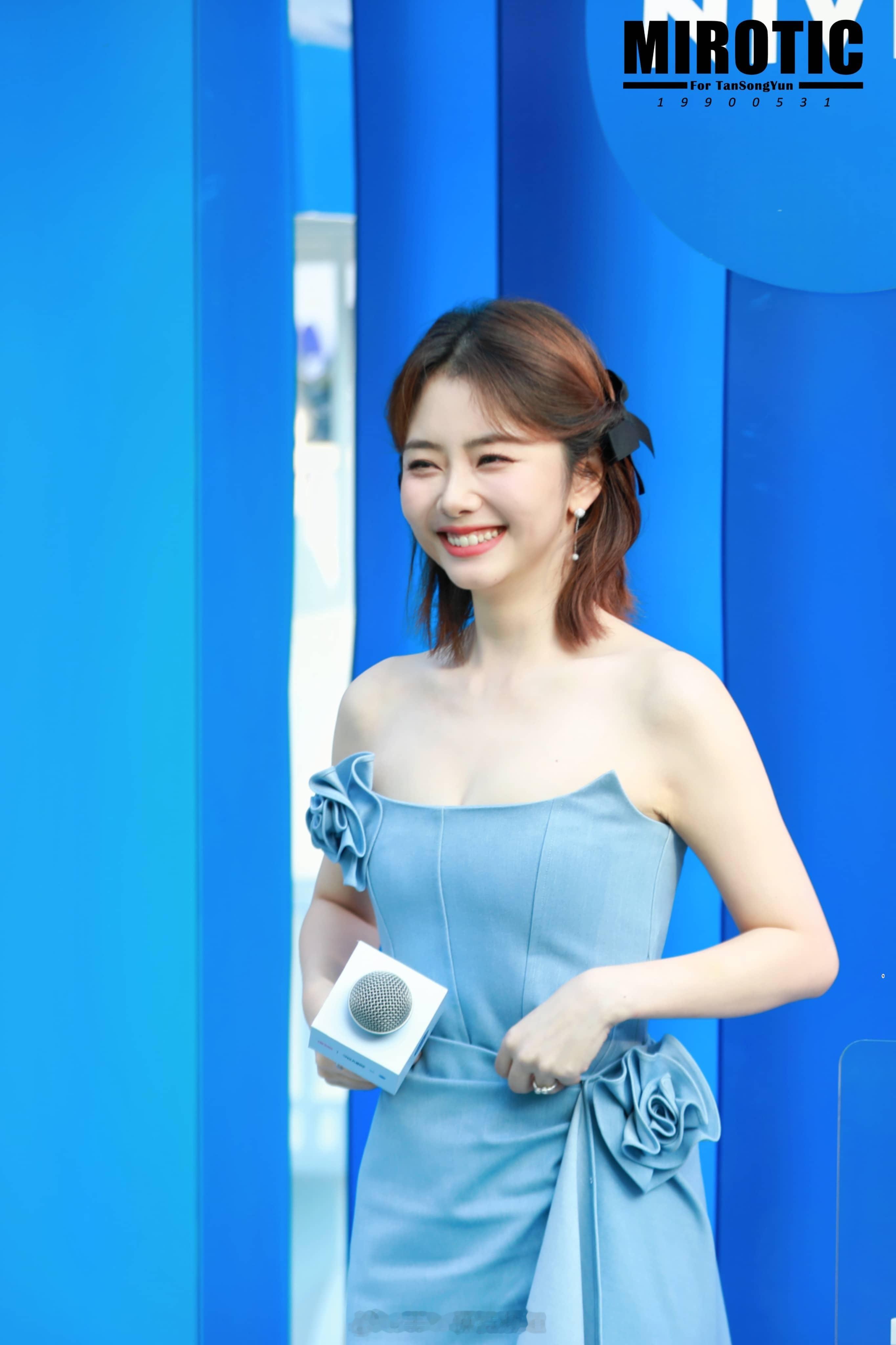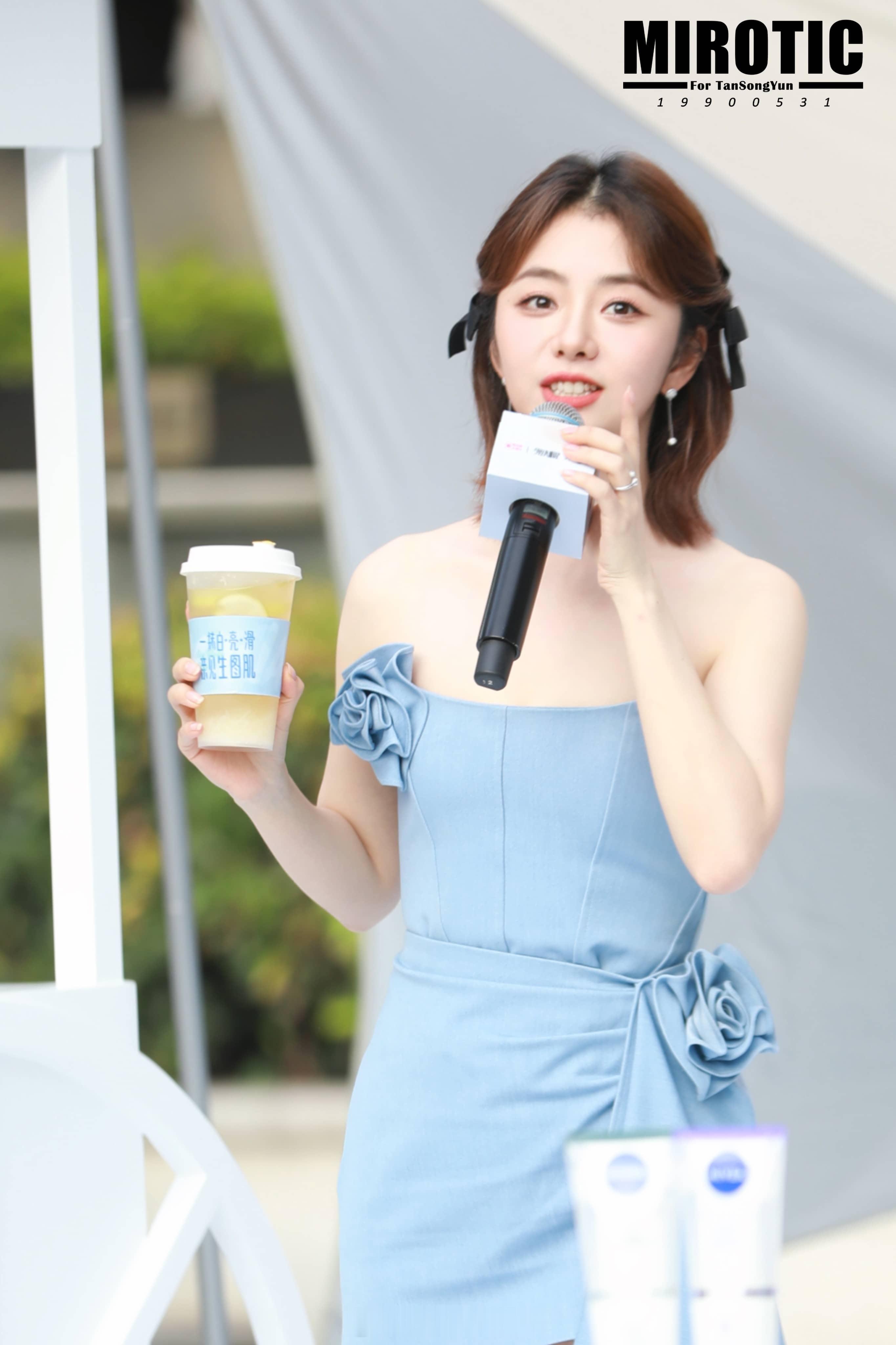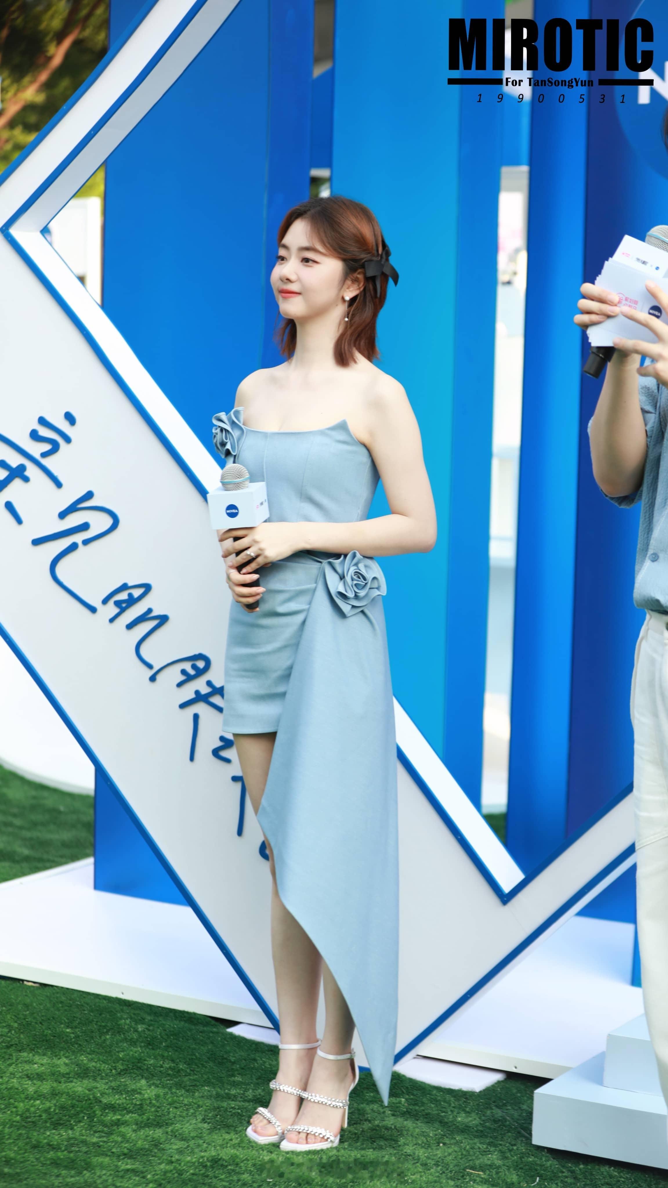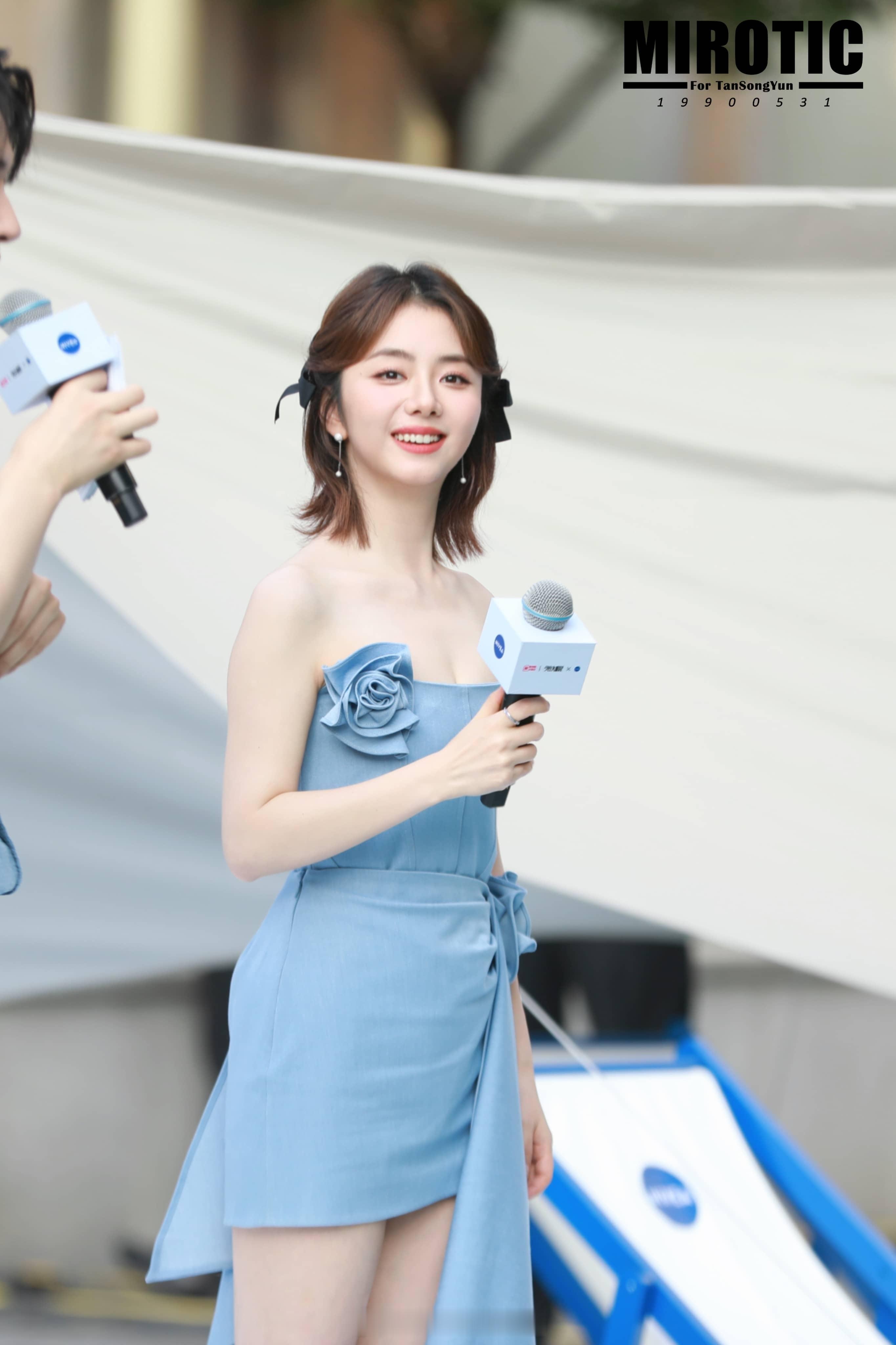 谭松韵蓝色抹胸花朵裙少女感满满