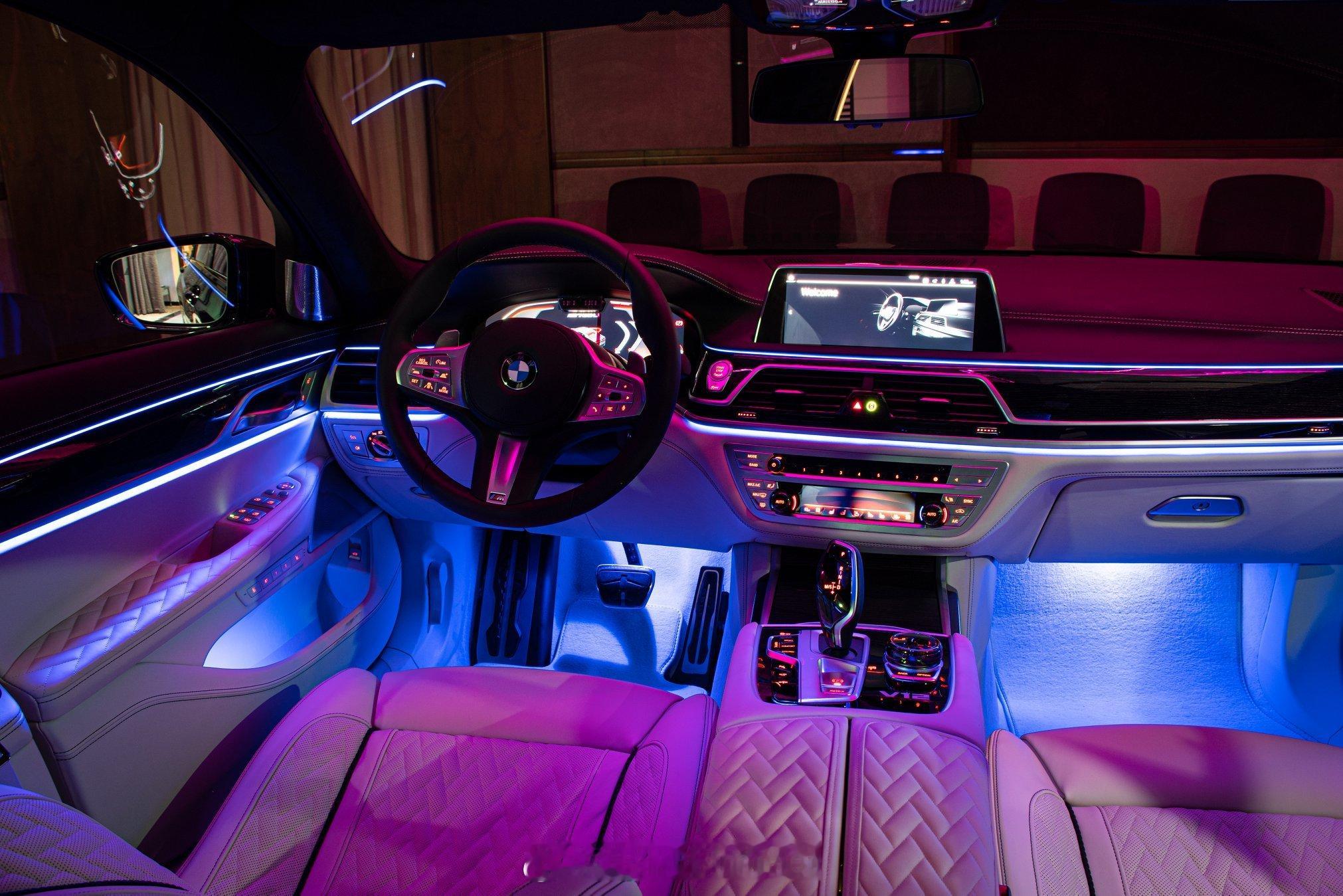 说个很少人注意到的,以前很多人说奔驰内饰的氛围灯很带感,坐进去跟“夜店”一样,但我感觉这款宝马7系的灯带所营造的氛围也很到位,从门板、音响头、天窗到底部踏板位置,再加上宝马本身对橙红色按键背光的坚持,整体效果也不错。