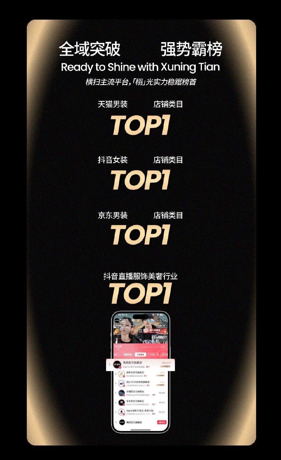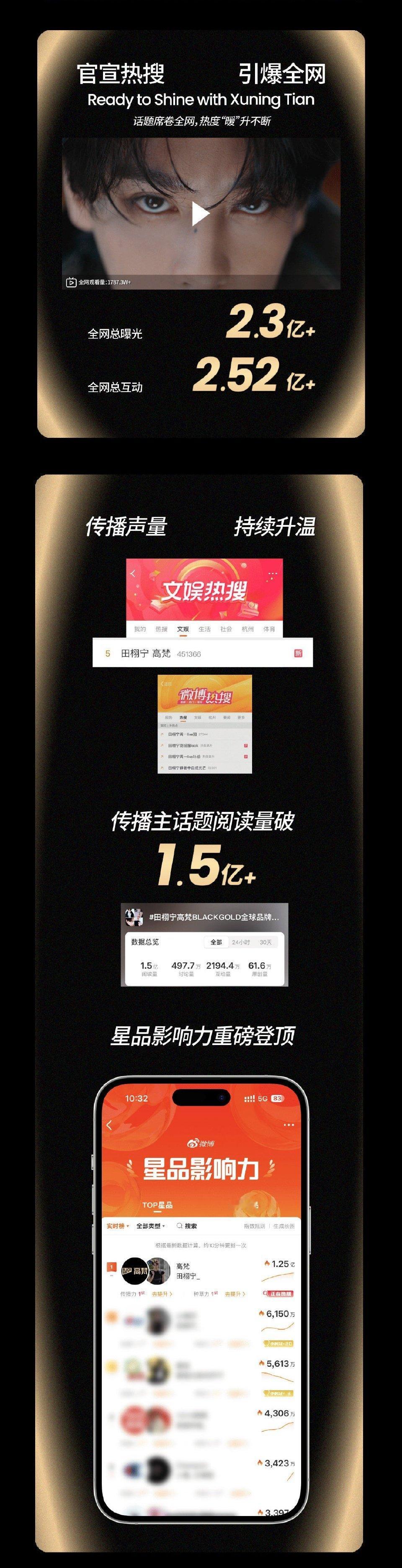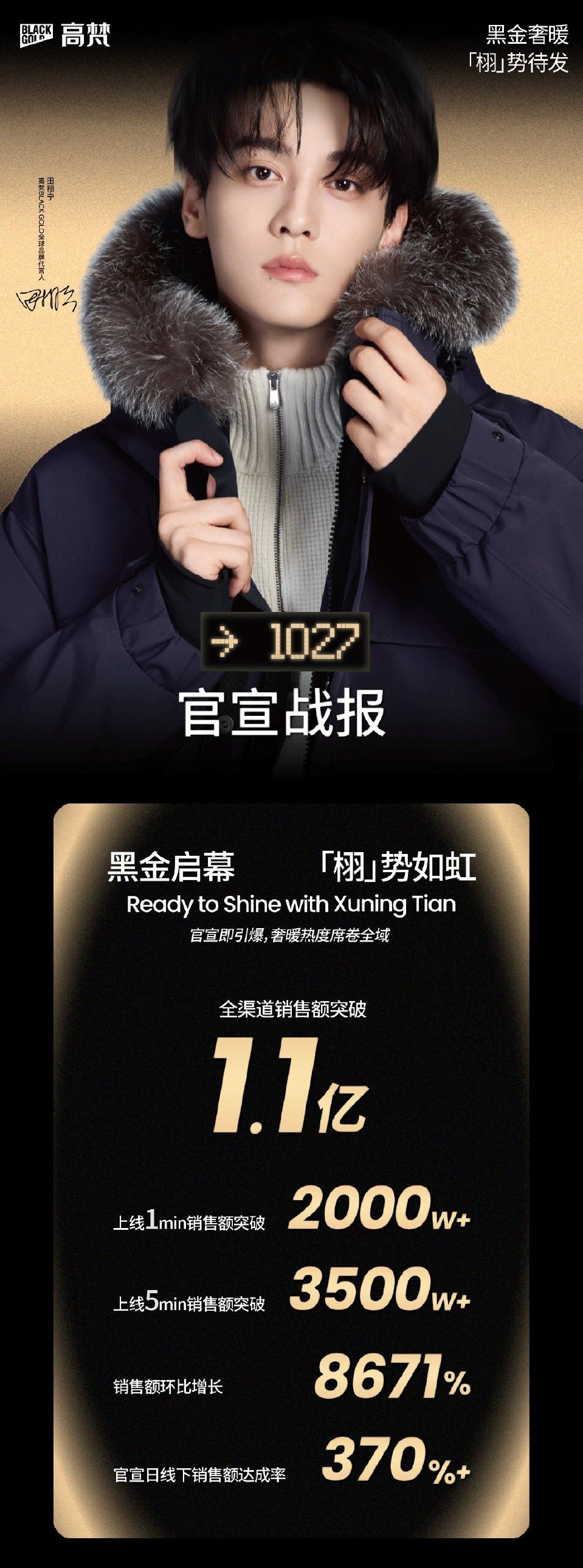 田栩宁高梵BLACKGOLD全球品牌代言人 高梵官方战报来啦,在非GMV且不是24小时,不含未备注订单和其他人的🔗情况下,田栩宁代言的高梵15小时销售额1.1亿‼️这就是商顶吗[期待]