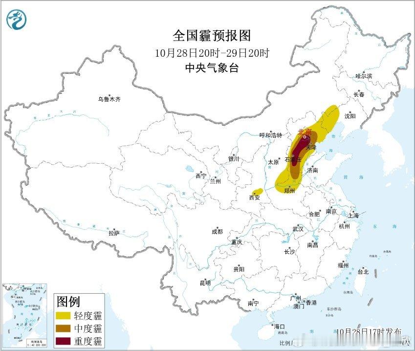 【雾和霾】今夜到明天上午,北京、天津、河北、甘肃东部、陕西中北部、河南中西部、山东西北部、湖北西部、贵州东部和西部等地的部分地区有大雾天气,其中北京南部、天津北部、河北中部、河南北部、湖北西部等地的部分地区有能见度不足500米的浓雾,局地有能见度不足200米的强浓雾。