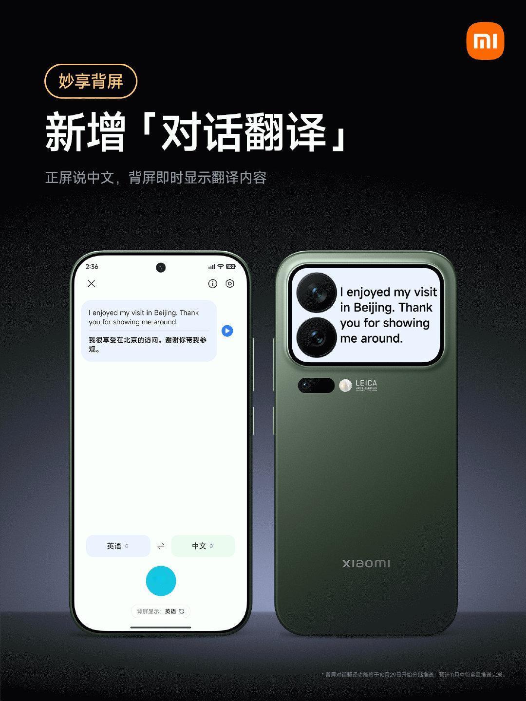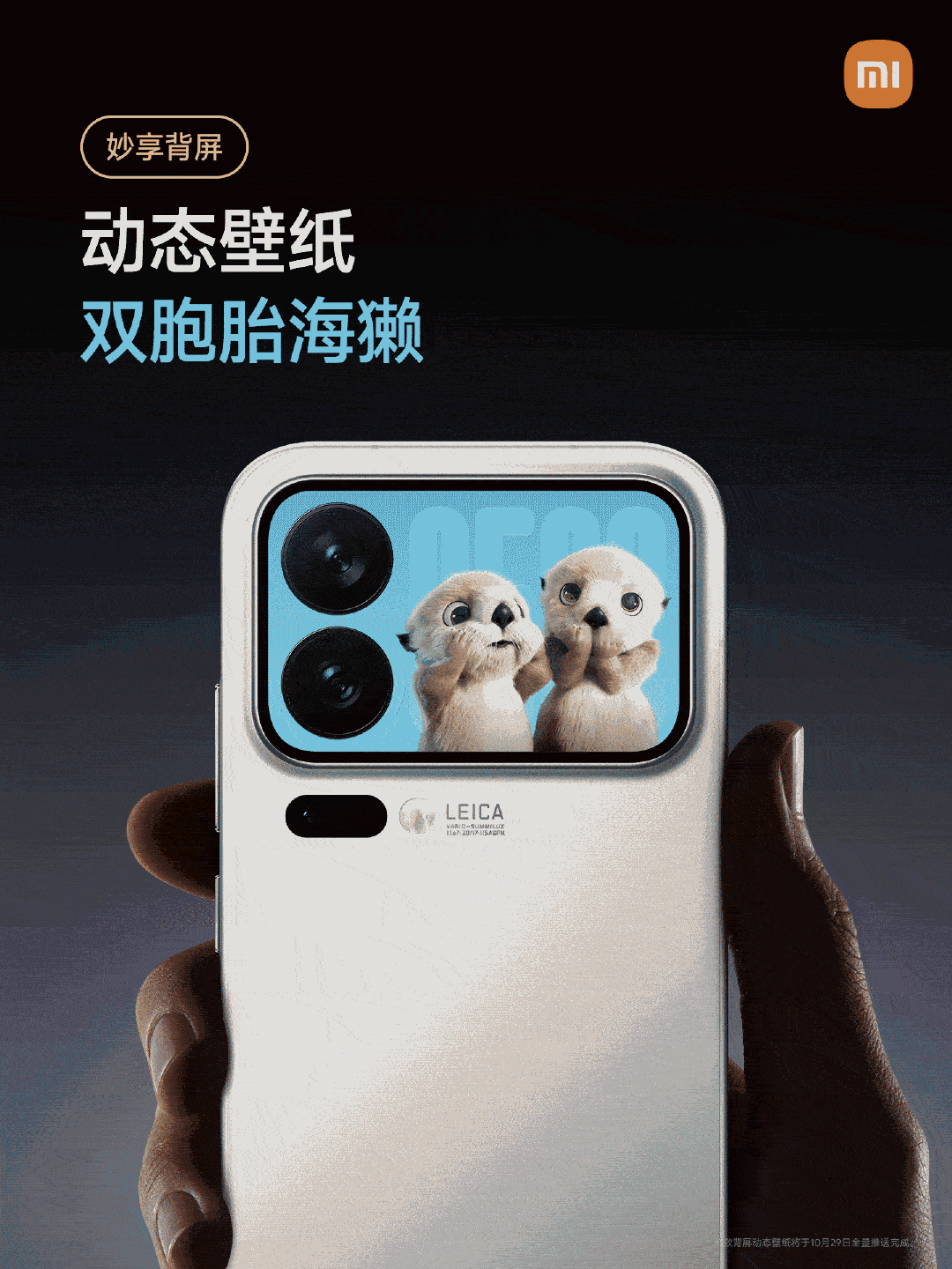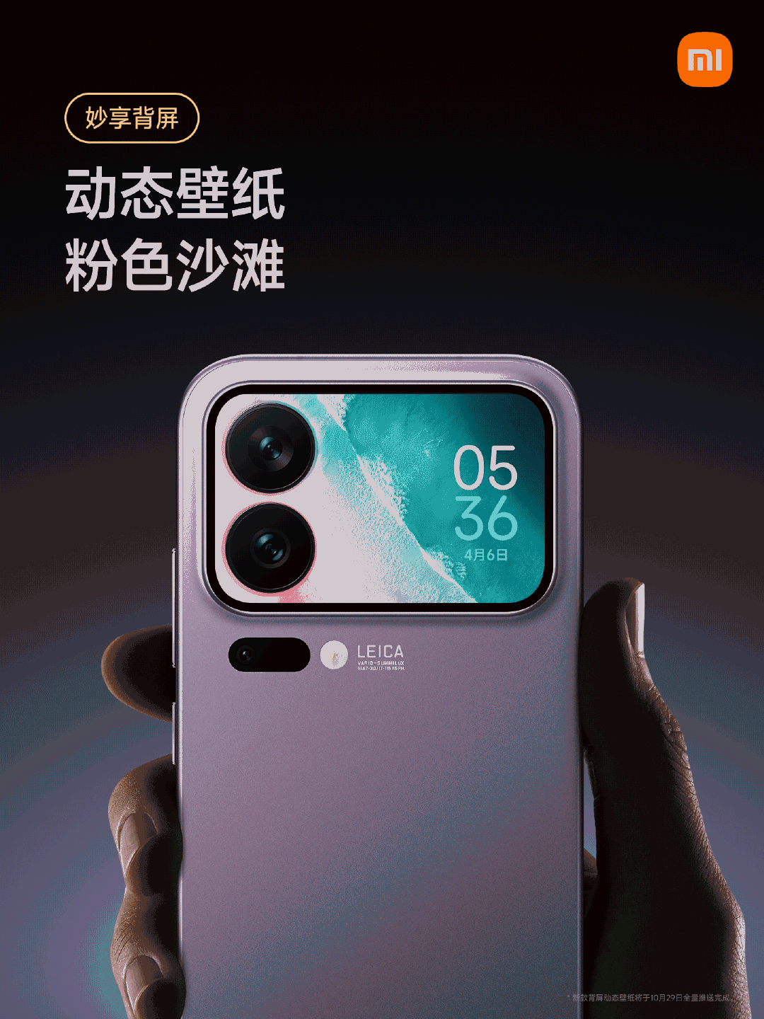 小米17Pro系列妙享背屏迎来新玩法 10月29日上午10点,陆续推送更新 1. 动态大头贴模式 背屏大头贴模式支持拍摄动态照片,同时新增明亮风格模板 2. 全新对话翻译 正屏说中文,背屏即时显示翻译内容 3. 新增五款动态壁纸 - 猫抓板时间 - 双胞胎海獭 - 透明器件 - 地球之美 - 粉色沙滩 4. 全新掌机游戏 - 植物大合成 - 雪人推箱子