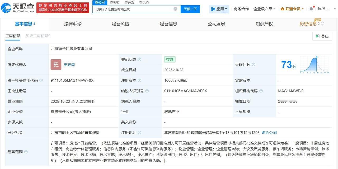 扬子江药业集团在北京成立置业公司注册资本1000万 天眼查App显示,近日,北京扬子江置业有限公司成立,法定代表人为史志岗,注册资本1000万人民币,经营范围包括房地产开发经营、非居住房地产租赁、商业综合体管理服务、会议及展览服务等。股东信息显示,该公司由扬子江药业集团旗下扬子江(广东横琴)健康投资有限公司全资持股。 天眼查信息:
