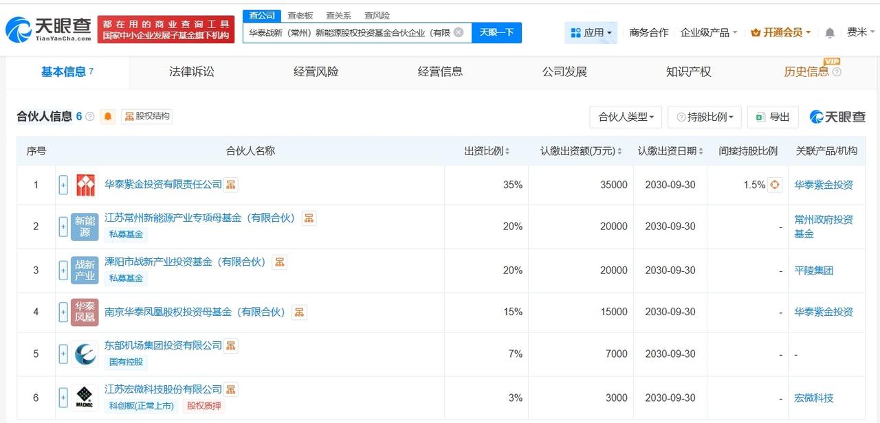 华泰证券、宏微科技等在常州成立新能源股权投资基金出资额10亿 天眼查App显示,近日,华泰战新(常州)新能源股权投资基金合伙企业(有限合伙)成立,执行事务合伙人为华泰紫金投资有限责任公司,出资额10亿人民币,经营范围为股权投资,创业投资,以私募基金从事股权投资、投资管理、资产管理等活动,由华泰证券旗下华泰紫金投资有限责任公司、宏微科技、江苏常州新能源产业专项母基金(有限合伙)等共同出资。 天眼查信息: