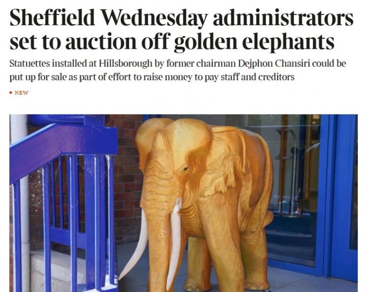 直播吧10月28日讯据《泰晤士报》报道,进入托管状态的谢周三俱乐部正采取多种措施筹集资金,托管人准备拍卖掉前主席钱西里安放在希尔斯堡球场的两尊标志性金象雕像。这些雕像因担心被球迷破坏或盗窃已被移至室内。