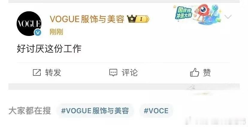 分享一点乐子[耶]今天VOGUE杂志小编皮下切错号吐槽:好讨厌这份工作!!这种官